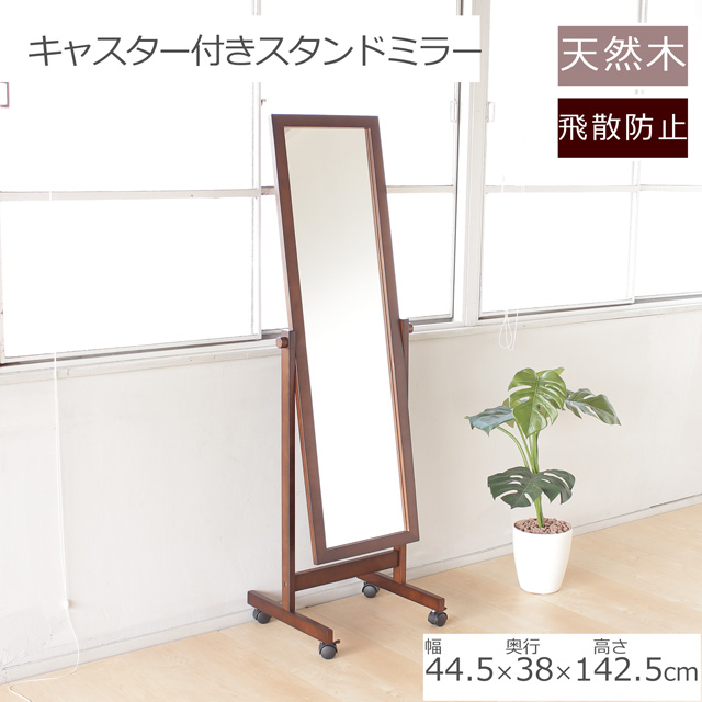 スタンドミラー 全身鏡 姿見 移動キャスター付 ブラウン 天然木 角度調整可能 飛散防止加工 おしゃれ 幅45cm 高さ143cm