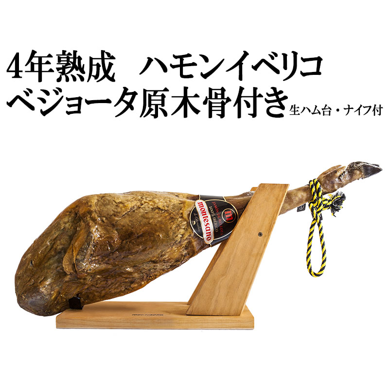 ■ 商品名 : スペイン産 ハモン・イベリコ・デ・ベジョータ(骨付き原木1本)・生ハム台・生ハムナイフ付き