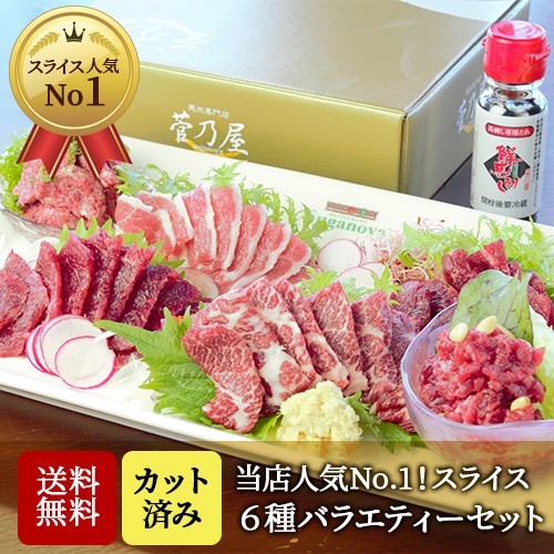| 商品内容 | ・霜降り(40g)×1p ・ロース(40g)×1p ・赤身(40g)×1p ・フタエゴ(40g)×1p ・桜うまトロ(馬肉ネギトロ)(60g)×1p ・赤身ユッケ(50g)×1p ※鮮馬刺し専用50mlボトルタレ1本 ※ユッケ専用15g小袋タレ1p付き |