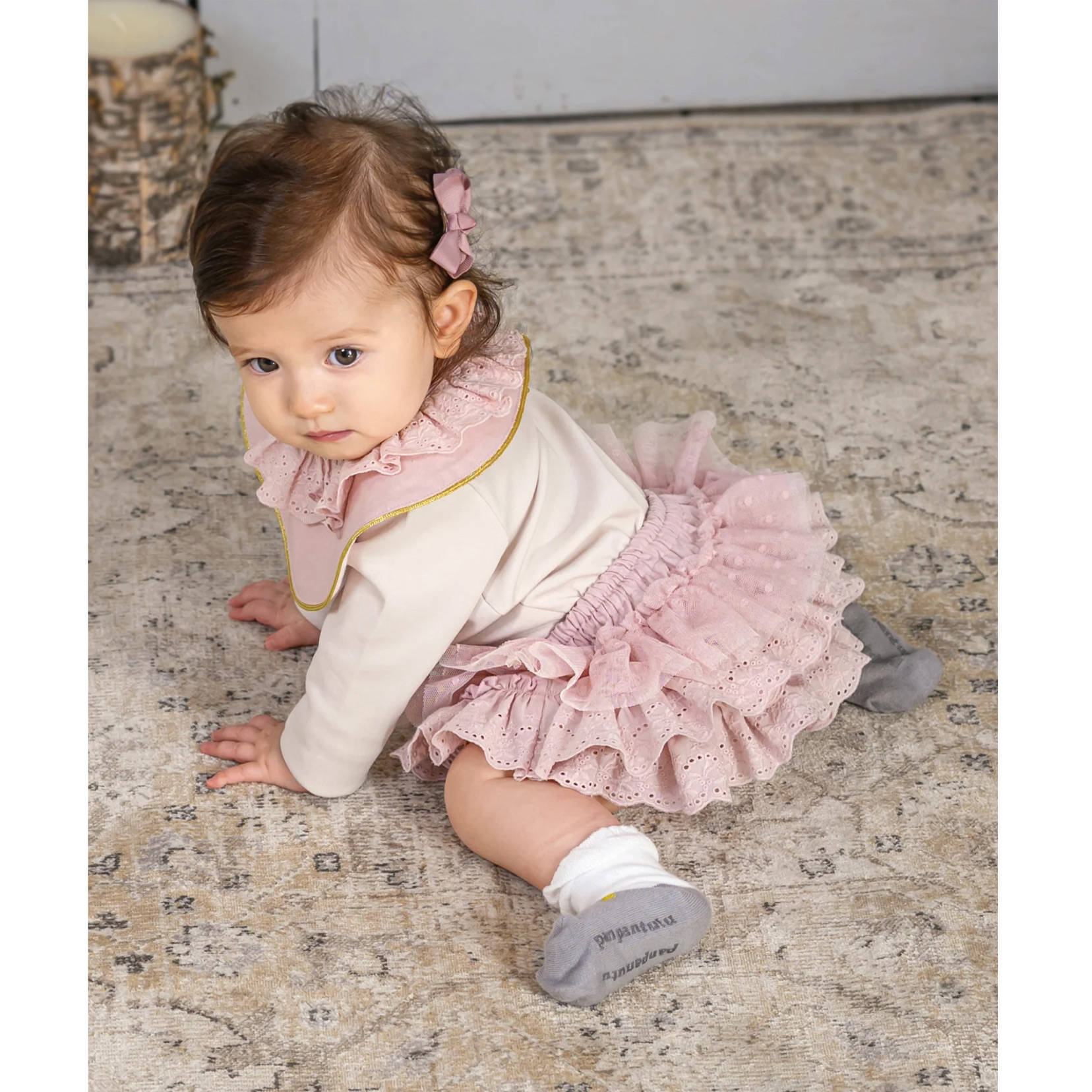 ほんのり甘く愛らしい印象のエンジェルピンク。フリルはコットンレース、無地のチュール、水玉チュールのグラデーション。高級感のあるサテンリボンがポイント。