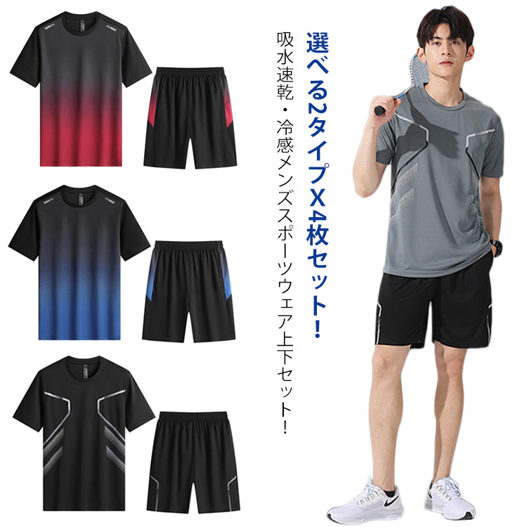 | 選べる2タイプx4枚セット!吸水速乾・冷感メンズスポーツウェア上下セット! 触れた瞬間感じる爽やかな冷感素材が特徴。一日中衣類内の温度を快適に保ちます。 吸水速乾性と通気性に優れたドライ生地でたくさん汗をかいても直ぐに乾いてべとつかず、優れた抗菌効果で嫌な臭いもしっかり防ぐ。 高いストレッチ性でどんな体型、動きにもフィットし、運動時にも最適。 | |