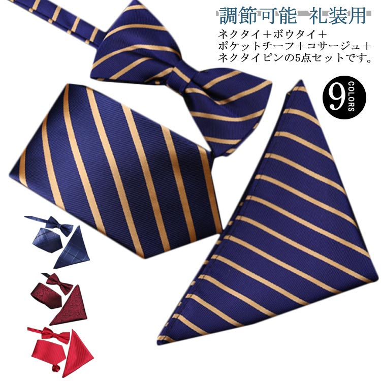 | ・ネクタイ+ボウタイ+ポケットチーフ+コサージュ+ネクタイピンの5点セットです。 ・カジュアルやビジネスウェアにおいても、手軽にオシャレを楽しめ、簡単にドレスアップ出来ます。 ・ビジネスの場面ではもちろん、スーツを着用する様々なシーンでご利用頂けます。 ※ジップ式(ワンタッチ):ファスナーが組み込まれており、どなたでもお手軽にネクタイを装着することが可能です。 | |