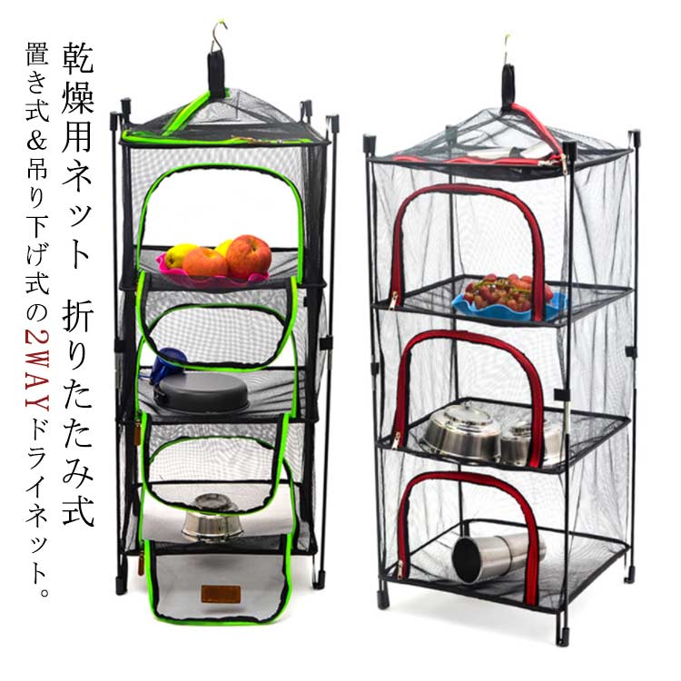 キャンプ用ドライネット 干し網 折りたたみ式 ハンギングネット 2WAY 置き式 吊り下げ 四層構造 収納ラック 軽量 虫よけ網 干物づくり 水切り