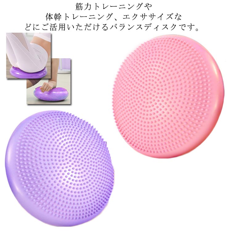 | 筋力トレーニングや体幹トレーニング、エクササイズなどにご活用いただけるバランスディスクです。 バランスディスクで体幹を鍛える。 バランスディスクに乗ることにより、倒れそうになる体を前後左右の筋肉がリカバリーすることで、日ごろ使わない筋肉を活性化させ、バランスよく体全体の筋肉を引き締めます。 エアーポンプが付属しているので、届いてすぐ始められます。力がない女性でも簡単にセットアップ可能。 【空気の入れ方】 表面に小さな穴がありますので、そこに針をぐっと挿し込んでください。 ※過度に空気を入れた状態でのご利用は、破損等の原因にもなり、大変危険ですのでご注意ください。 【空気の減らし方】 空気針だけを表面の穴へ奥深く挿し混みます。 バランスディスクに体重をかけて空気を抜いてください。 | |