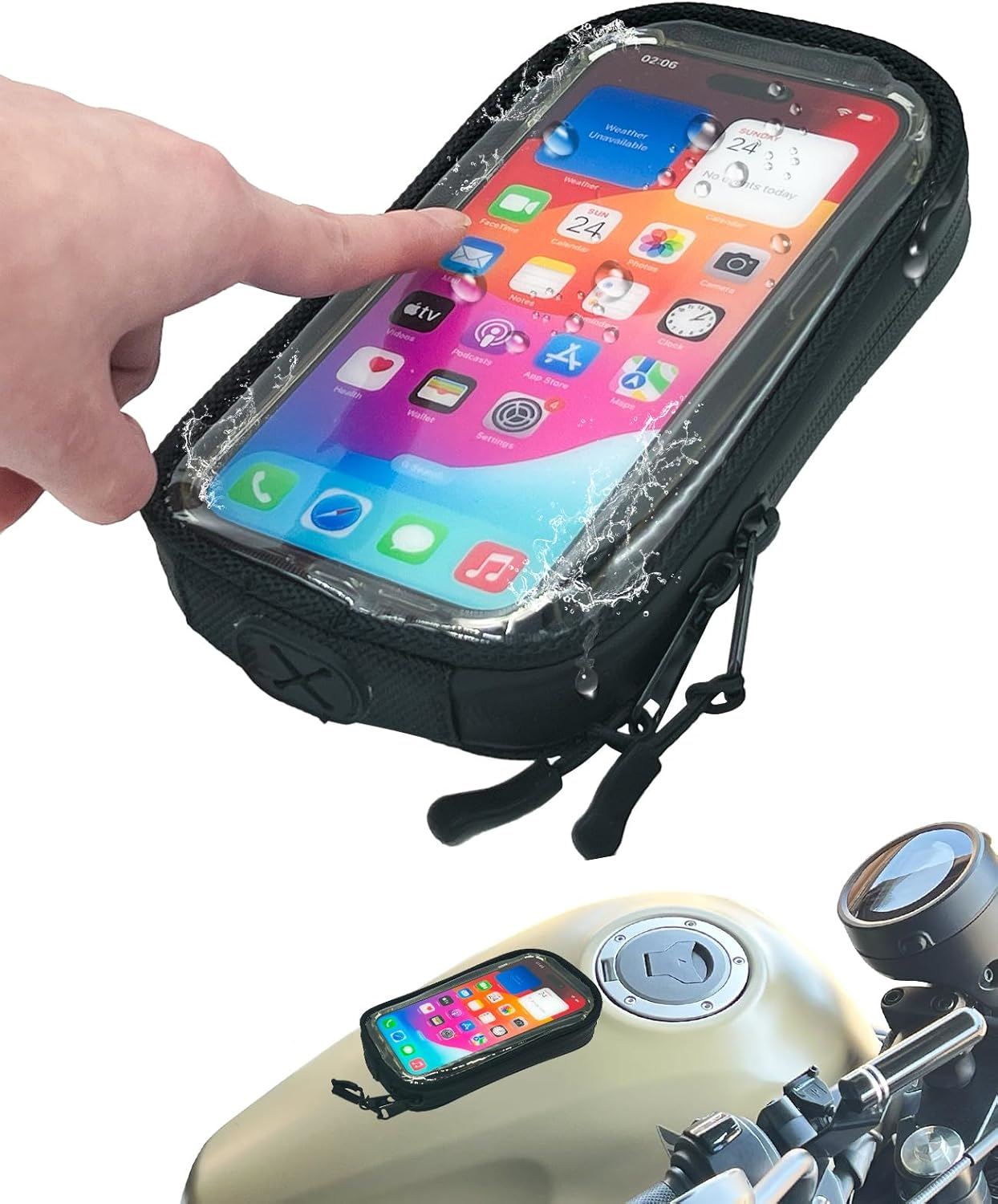 ?【強力マグネット】7個の強力マグネットでタンクにピタッ?面倒な取付不要。スマホを収納して燃料タンクに置くだけ。設置面の材質はPUレザー製でタンクを傷つけません。<br>