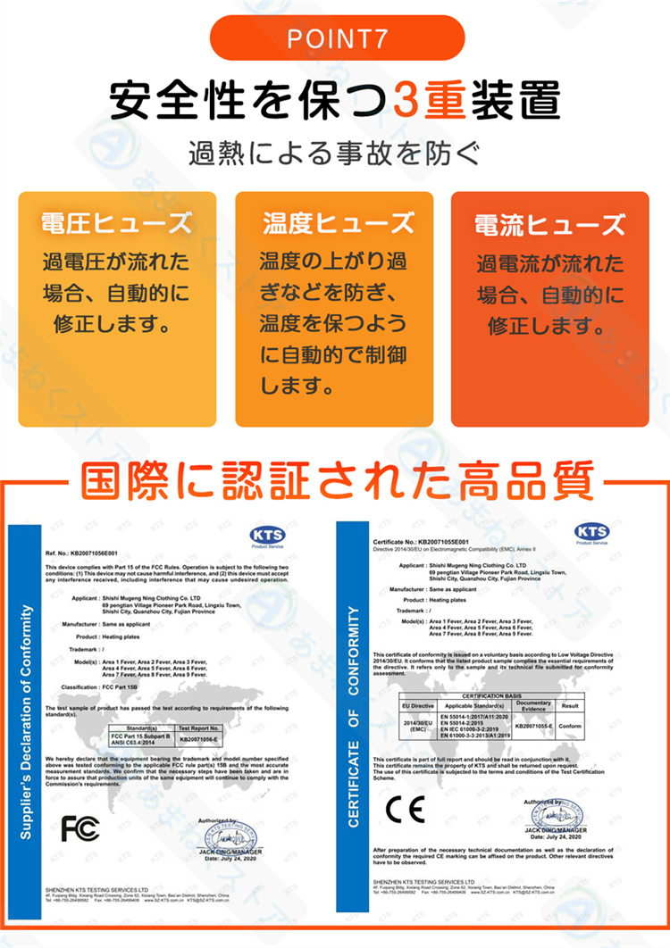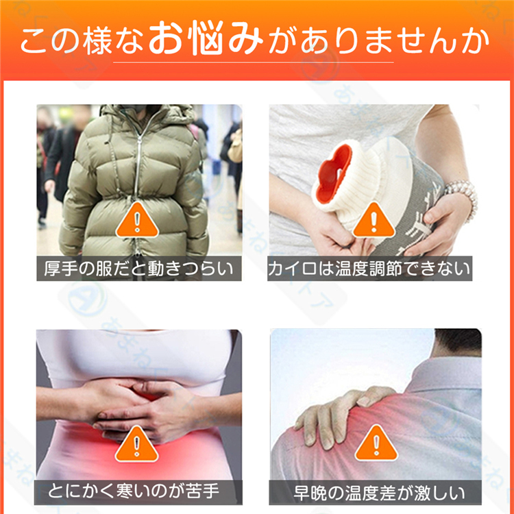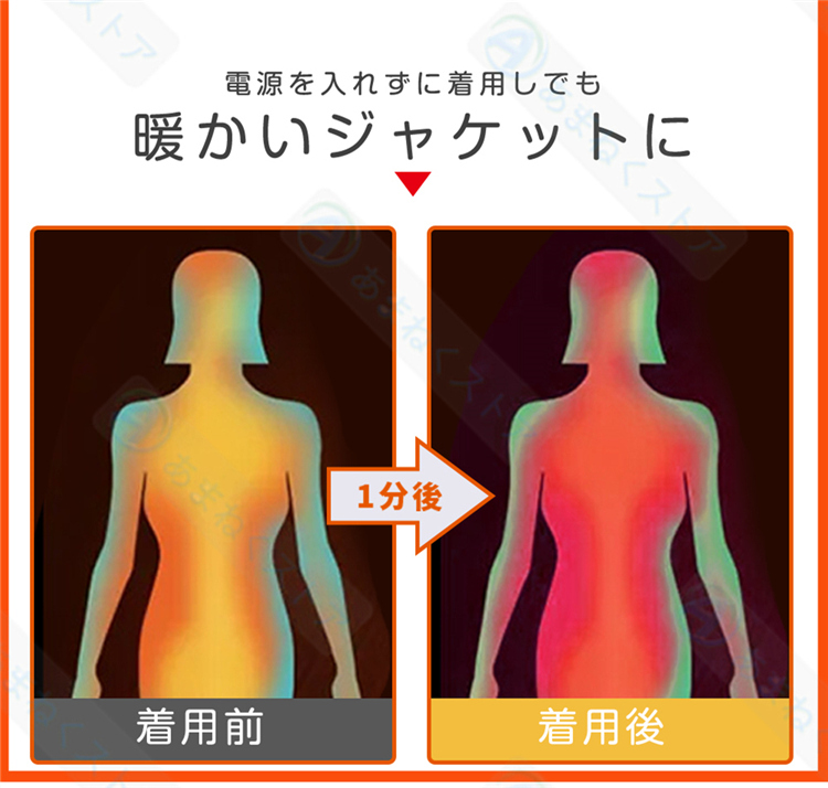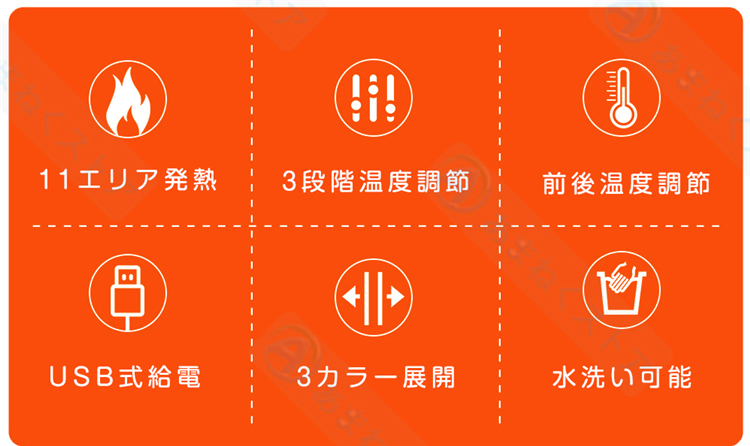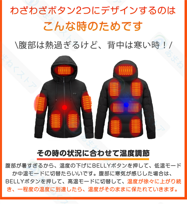 【前後独立スイッチ・3段階温度調整】首、背中、腰に11枚の繊維発熱体(ヒーター)を内蔵し、スイッチを入れると迅速に発熱できるので、僅か10秒で暖かさを実感できます。胸元のスイッチを押すだけで、強(約55℃)、中(45℃)、弱(約39℃)の3段階に温度を自由に調節できます。さらに、前後独立して操作可能で、お好みや使用シーンに合わせて便利にご利用頂けます。