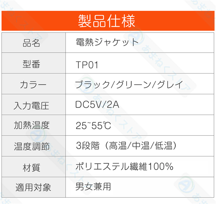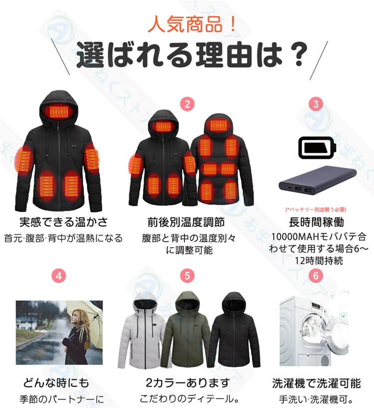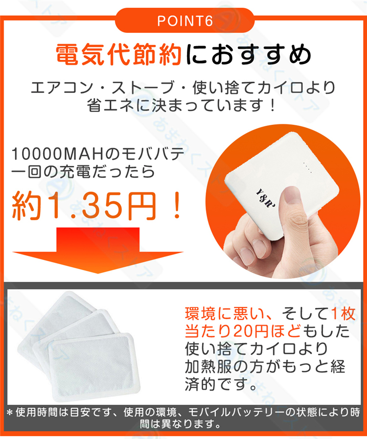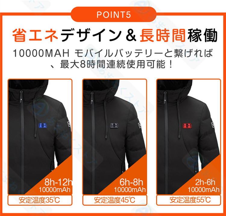 【USB給電式・省エネ】電熱ジャケットにUSB差込口が搭載されており、お持ちのモバイルバッテリー(別途購入必要)と接続して給電できます。収納ポケットにスッと入れられ、持ち運びも楽々です。室内で着用すると暖房費の節約にも繋がります。バッテリー容量:10000mAh。※自社測定による連続稼働時間:強(約3.5h)、中(約4.5h)、弱(約7h)
