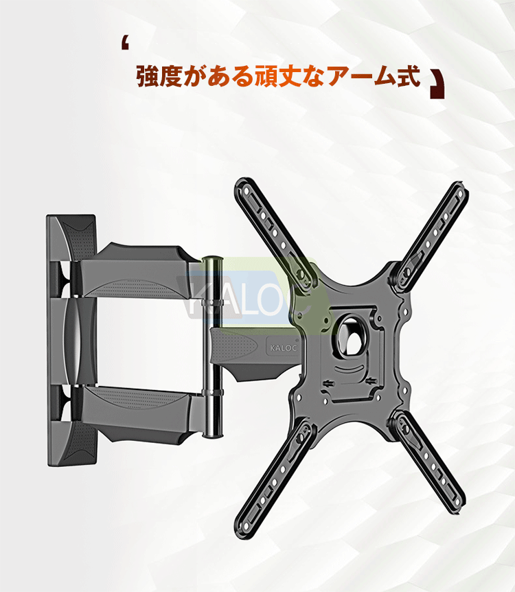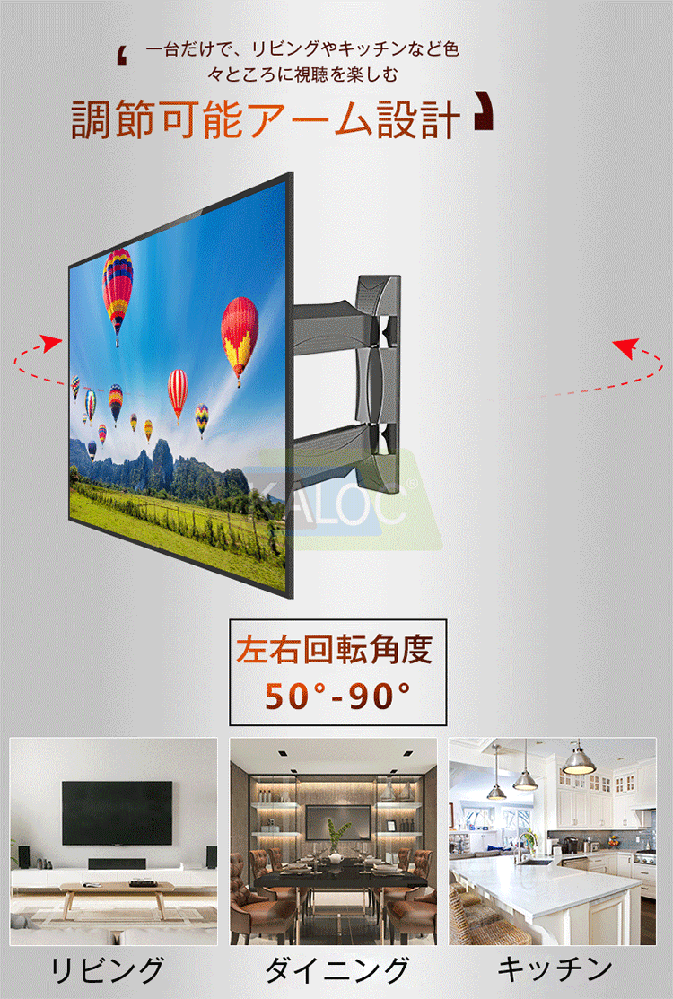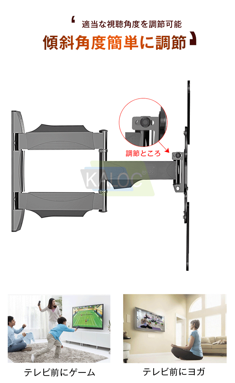 【角度調整可能】アームの左右角度調節は3箇所があります。1. 壁側の取付け部は左右各90度で角度が調整できます。2. アームとアームの接合部は壁面から55〜499mmまで調整可能です。3. テレビ取付け金具部は上向き8度、下向き5度で角度が調整できます。るので、引き出して必要な位置に画面を移動できます。