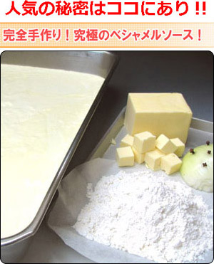 目の細かい篩(ふるい)にかけた小麦粉と、厳選した無塩バター、そして濃厚な牛乳を使用してつくるベシャメルソース。