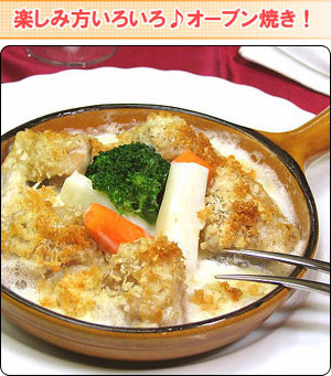 ↑上のように、グラタン皿にあけて、パン粉と粉チーズを散らして、オーブンで焼けば、『チキンパン粉焼き』の完成!!