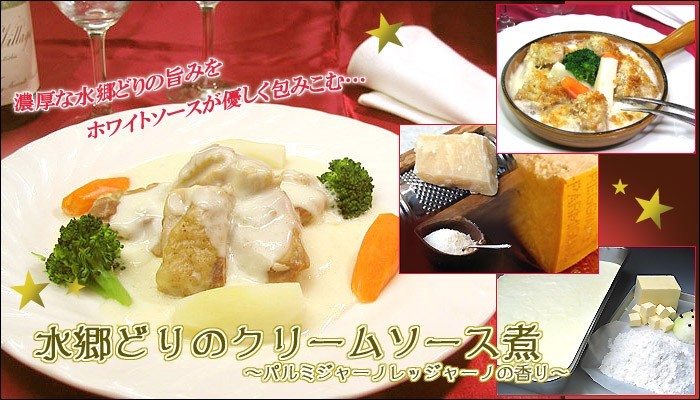 そのベシャメルソースに、水郷どりからとった透き通るような鶏がらスープを加え、じっくりと煮詰めてトロミを出しました。