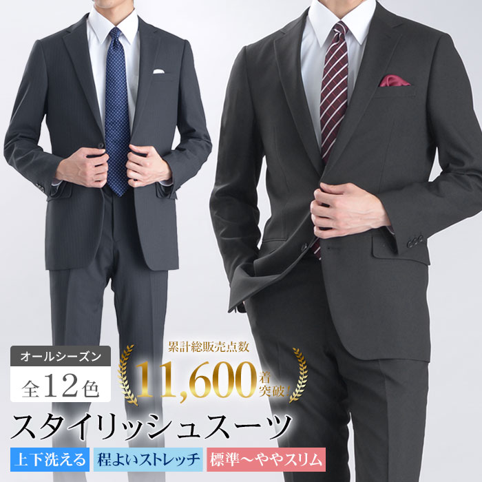 | <ジャケット> 2ツボタン シングルスーツ ノッチドラペル センターベント 背抜き仕立て ナチュラルストレッチ素材 袖3ツボタン ウォッシャブル機能 <パンツ> ノータック ローライズ ストレートパンツ 洗えるスラックス ウォッシャブル機能 |