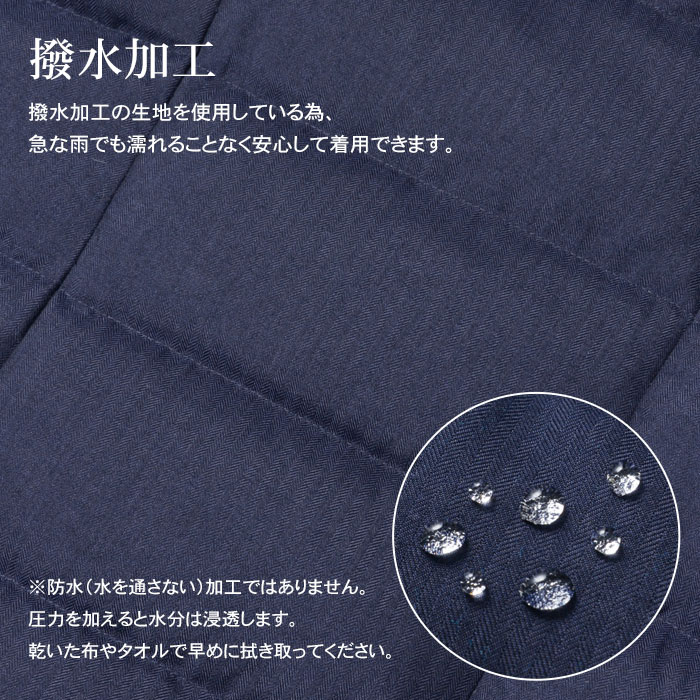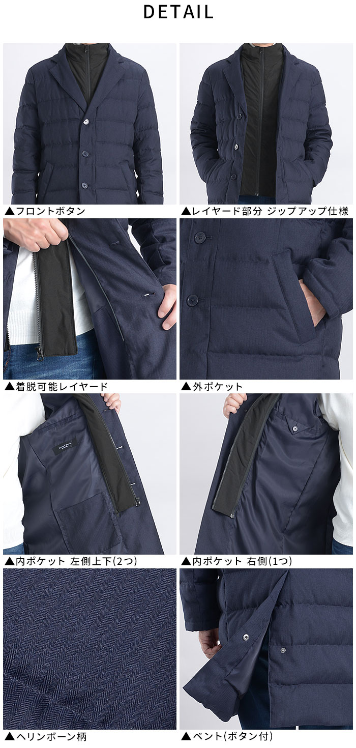 | 3つボタン、フェイクレイヤード、レイヤード着脱、フロント部分ジップアップ仕様、 センターベント、サイドポケット、内ポケット、ニーレングス丈 |