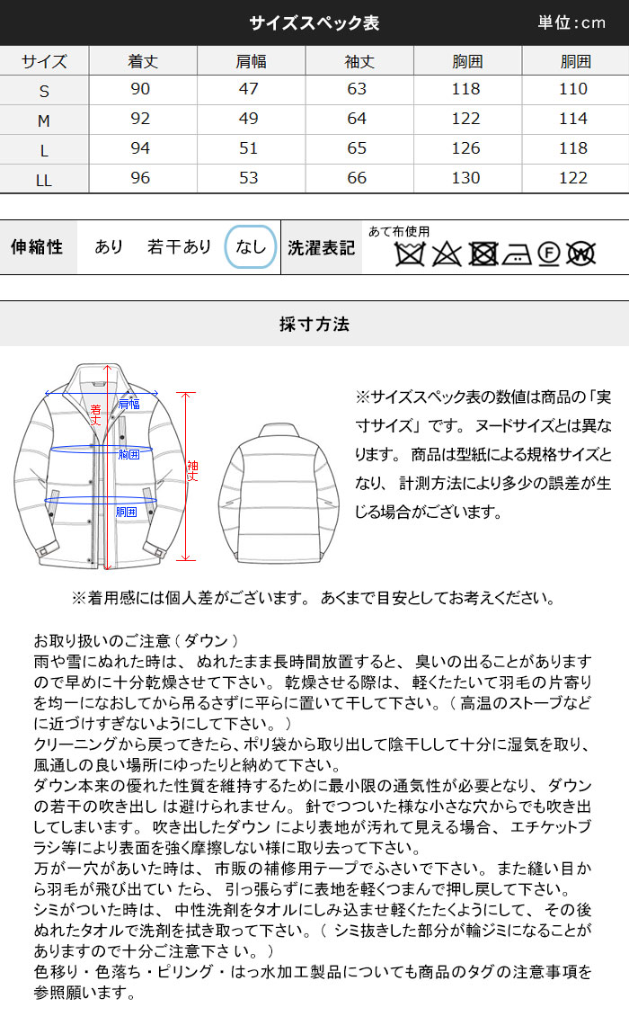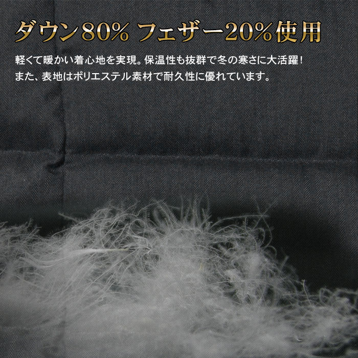| 表地:ポリエステル100% 裏地:ポリエステル100% 詰め物:ダウン80% フェザー20% |