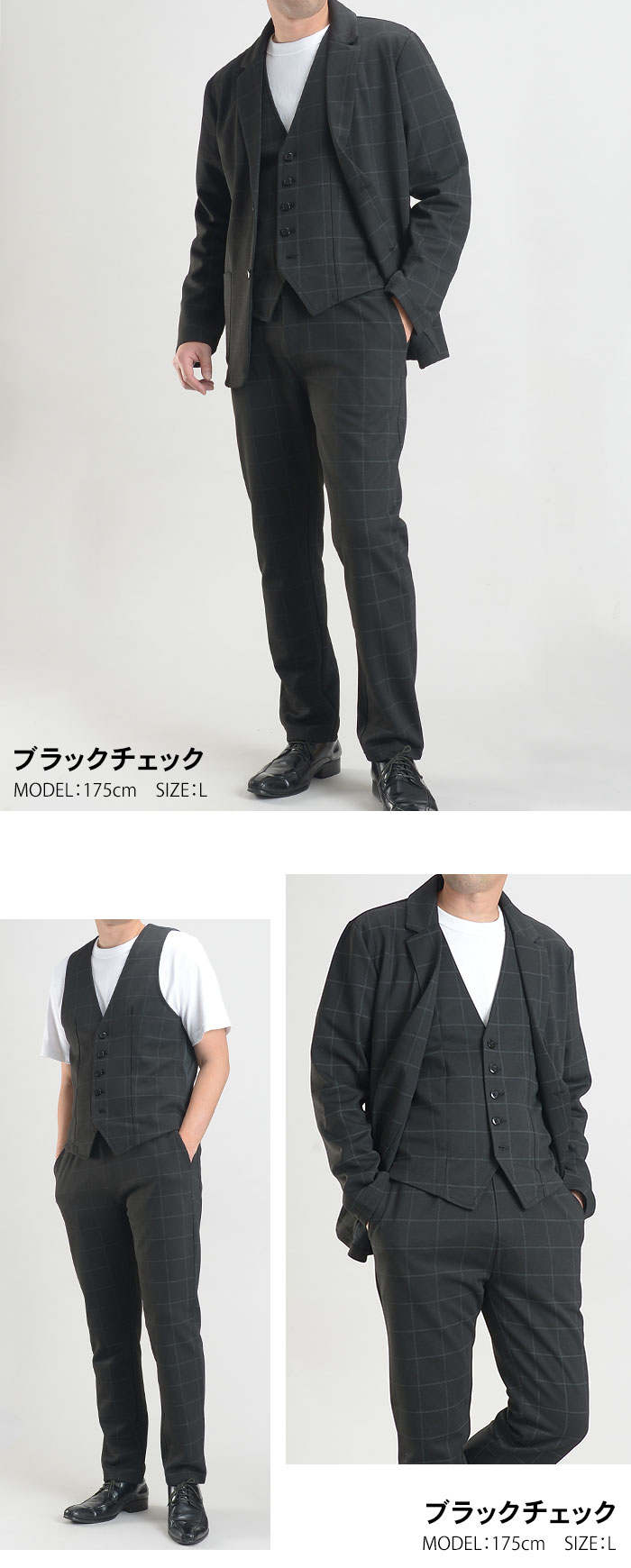 セットアップ 裾上げ済 メンズ 3ピース スーツ カジュアルスーツ スリーピーススーツ チェック ポンチ素材 スウェット ストレッチ