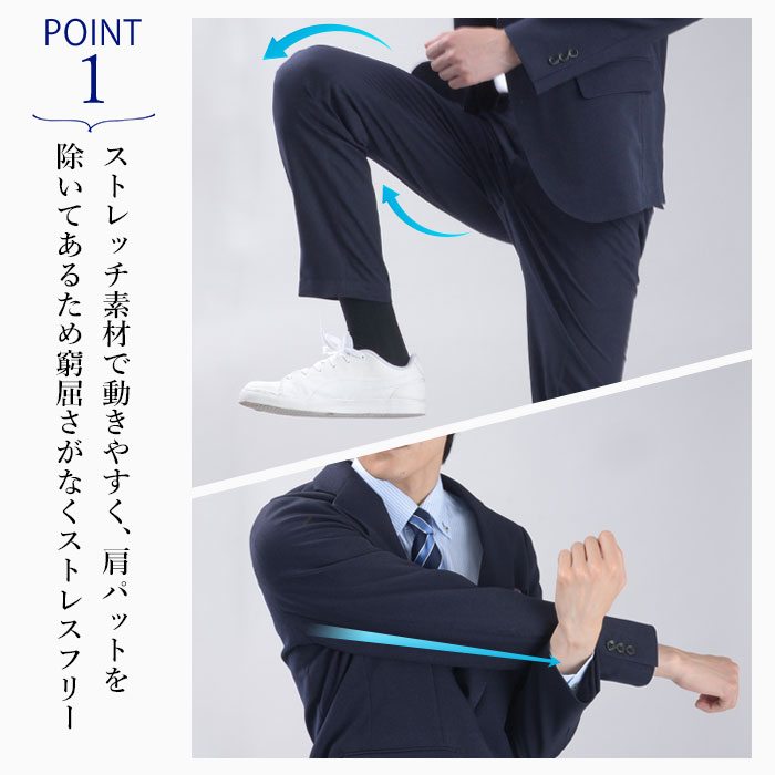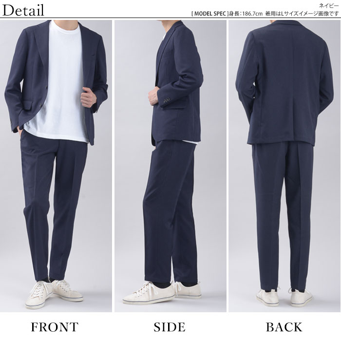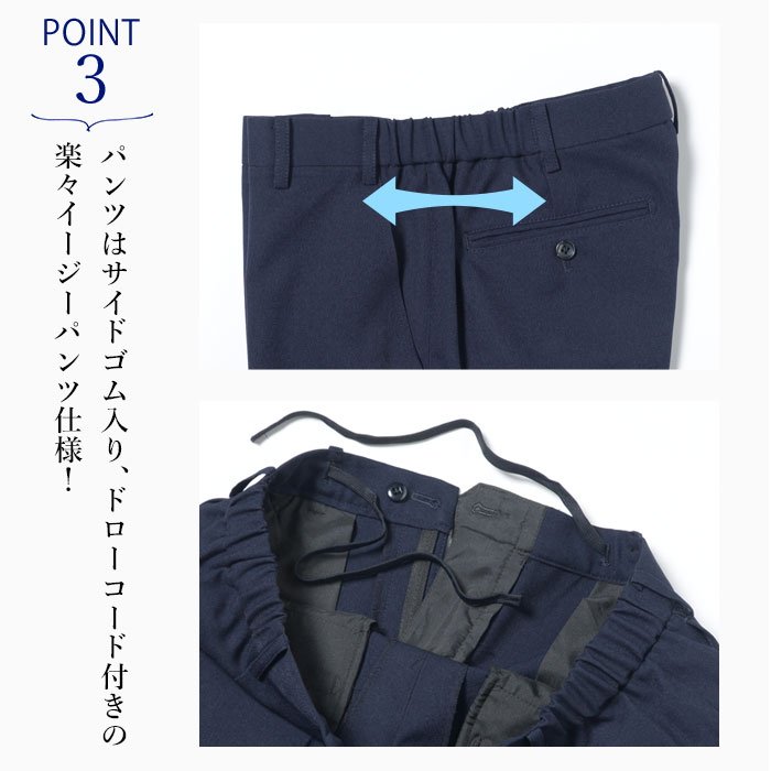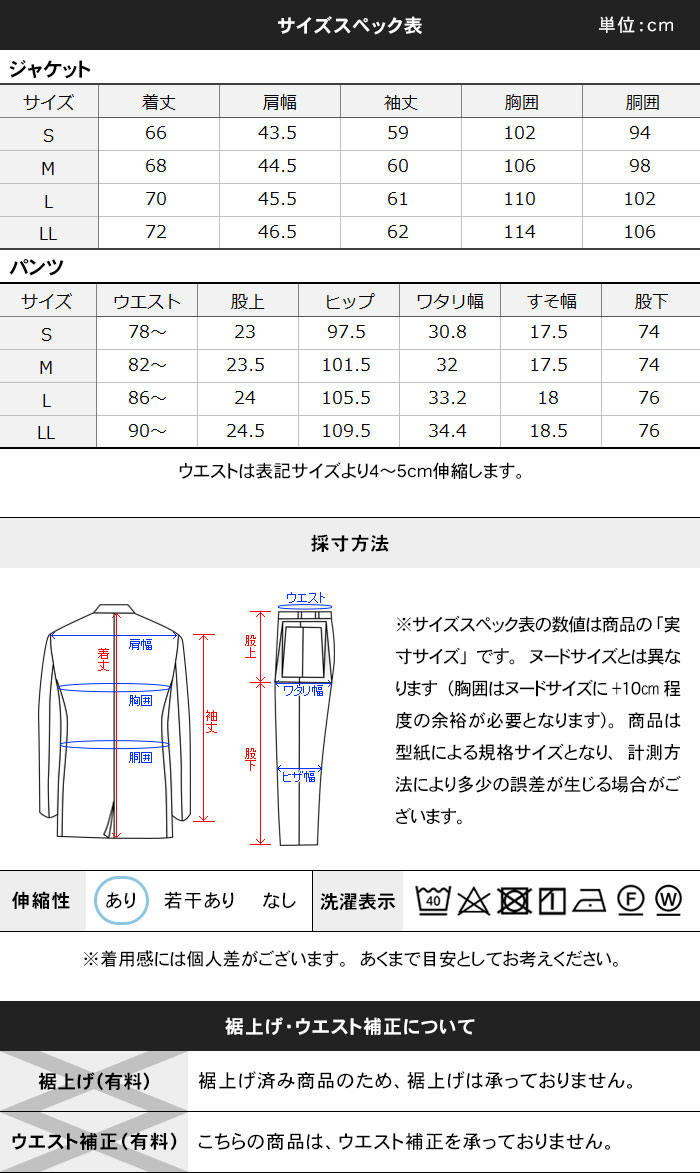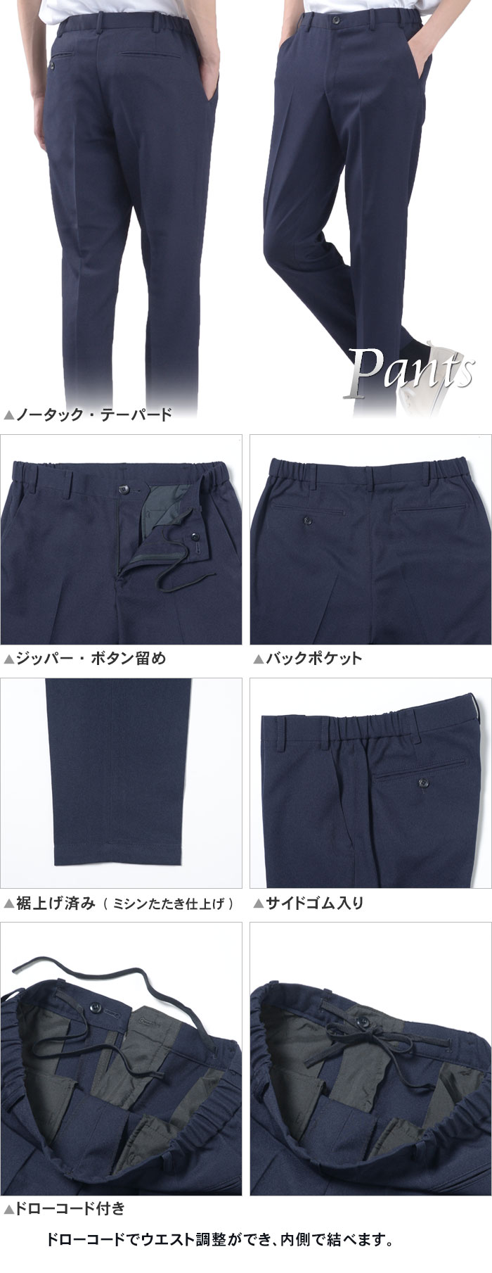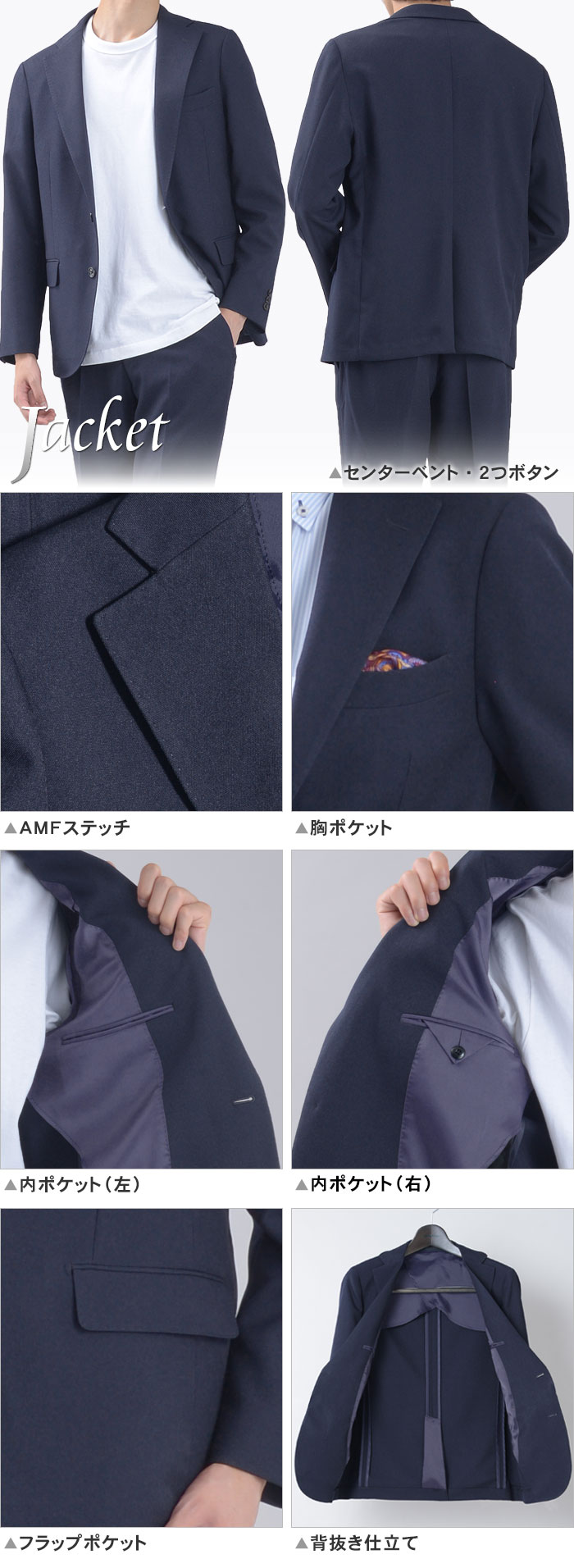 | ◆ジャケット 2ツボタン センターベント 胸ポケット 内ポケット 肩パッド無し ウォッシャブル仕様 背抜き仕立て AMFステッチ 防シワ性 ストレッチ ◆パンツ ノータックパンツ ベルトループあり ウエスト両サイドゴム仕様 ウエスト調整紐付き ウォッシャブル仕様 股シックあり 膝裏なし 防シワ性 ストレッチ ※パンツの裾はミシン仕上げで裾上げ済みです。(裾上げは承っておりません) |