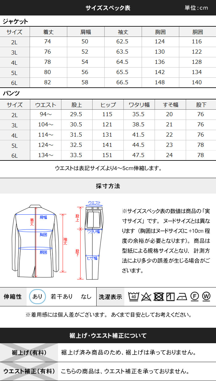 | ◆ジャケット 2ツボタン センターベント 胸ポケット 内ポケット 肩パッド無し ウォッシャブル仕様 背抜き仕立て AMFステッチ 防シワ性 ストレッチ ◆パンツ ノータックパンツ ベルトループあり ウエスト両サイドゴム仕様 ウエスト調整紐付き ウォッシャブル仕様 股シックあり 膝裏なし 防シワ性 ストレッチ ※パンツの裾はミシン仕上げで裾上げ済みです。(裾上げは承っておりません) |
