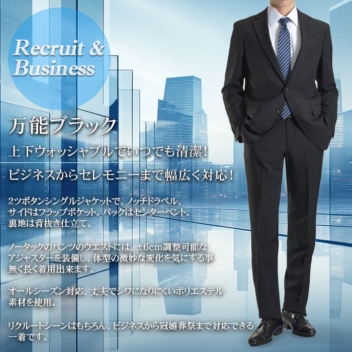 就活、会社訪問、面接におすすめ!リクルートスーツ スタイリッシュなデザインでビジネスからセレモニーまで幅広く対応!お手入れ簡単なウォッシャブル機能付&アジャスター付きでコストパフォーマンスに優れた一着です!