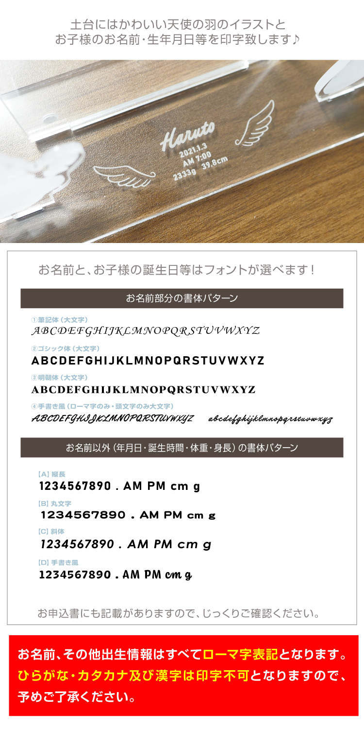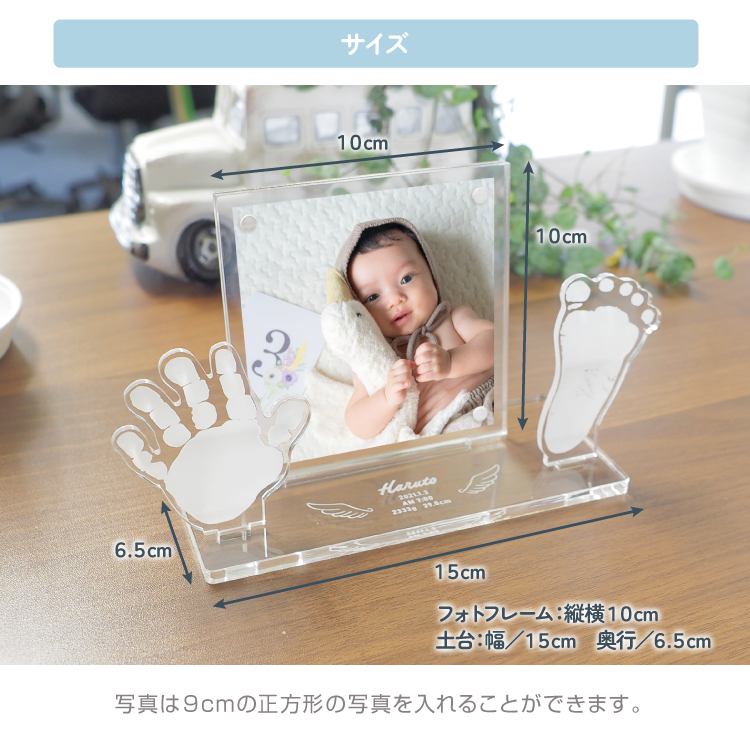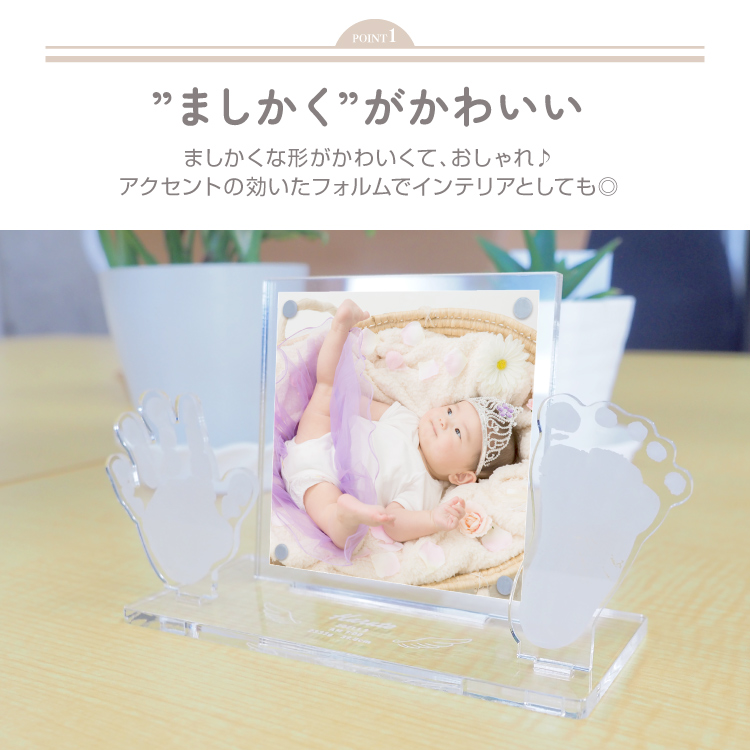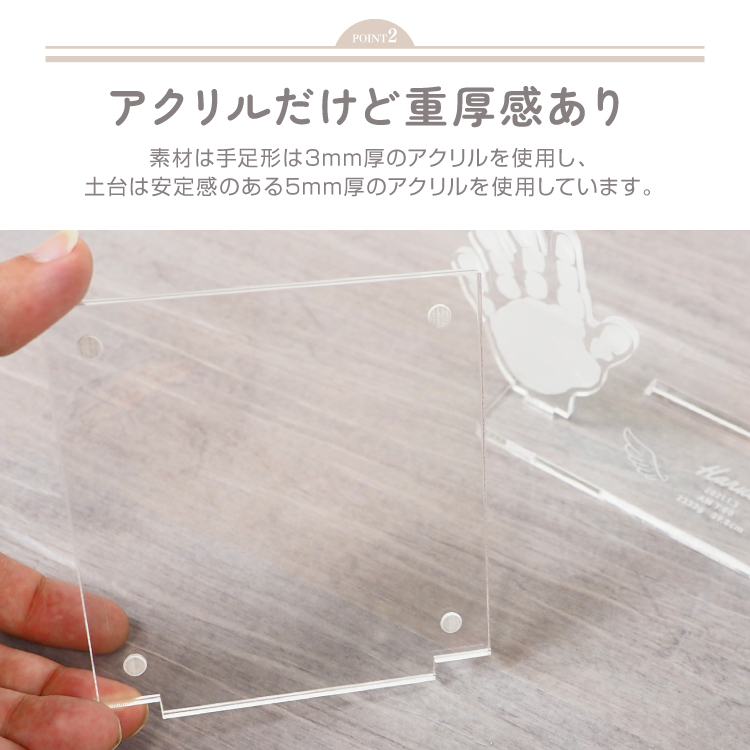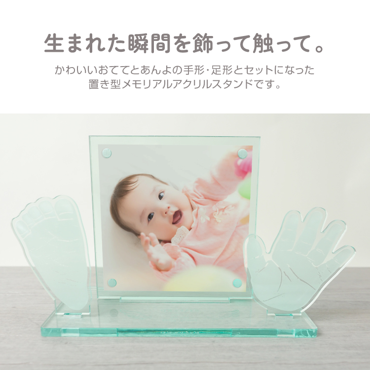 | ●生まれた瞬間を飾って触って。 かわいいおててとあんよの手形・足型がセットになった置き型メモリアルアクリルフォトスタンドです。 ●「ましかく」がかわいい ましかくな形がかわいくて、おしゃれ アクセントの効いたフォルムでインテリアとしても◎ ●アクリルだけど重厚感あり 素材は手足形は3mm厚のアクリルを使用し土台は安定感のある5mm厚のアクリルを使用しています。 土台にはかわいい天使の羽のイラストとお子様のお名前・生年月日等を印字致します♪ ●スタンド組み立て 土台にフォトフレームと手形・足形を差し込んで組み立てていただく商品となります。 フォトスタンドの四隅にはマグネットを施しておりますので付け外しが簡単。 写真を挟むようにしてスタンドを組み立ててください。 ●お名前と、お子様の誕生日等はフォントが選べます。 ※お子様の写真は付属致しませんのでお手持ちのお写真を挟んでお使いください。 |