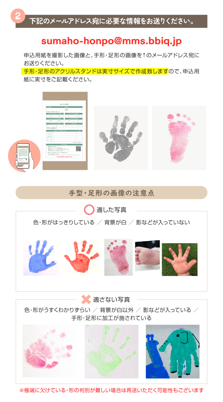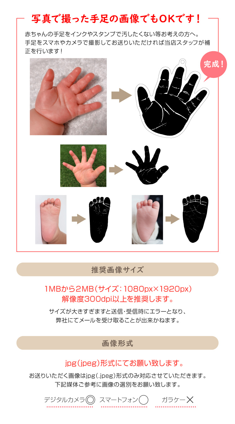 | 【1】ご注文 ご注文直後の自動配信メールと、当店で注文確認後の案内メールがそれぞれ届きます。また、お支払い方法が振込の場合は、ご入金確認後に案内メールをお送りします。 【2】情報送信 指定のメールアドレス宛に、申込用紙を撮影した画像と、手形・足形の画像をお送りください。※赤ちゃんの手足をインクやスタンプで汚したくない等お考えの方へ。 手足をスマホやカメラで撮影してお送りいただければ当店スタッフが補正を行います! ●推奨画像サイズ 1MBから2MB(サイズ:1080px×1920px)解像度300dpi以上を推奨します。※サイズが大きすぎますと送信・受信時にエラーとなり、弊社にてメールを受け取ることが出来かねます。 ●画像形式 jpg(jpeg)形式にてお願いします。 【3】当店より仕上がりイメージのメール及び画像をお送り致します。 ※1件ずつ手作業でのご対応となりますので、受注状況により数日かかる場合があります。 OK → 問題がなかった場合製作OKの旨をご返信ください。 ※制作開始後は、一切のキャンセル・修正はできません。 NG → 修正箇所があった場合 修正希望を変更される箇所を具体的に記載して、ご返信ください。 再度、修正したイメージ画像をお送り致します。 ※修正は3回までとさせていただきます。 【4】商品をお届け致します。 製作OKのご連絡をいただいてから概ね7日以内に発送手配を致します。繁忙期などはさらにお時間をいただく場合もございます。 |