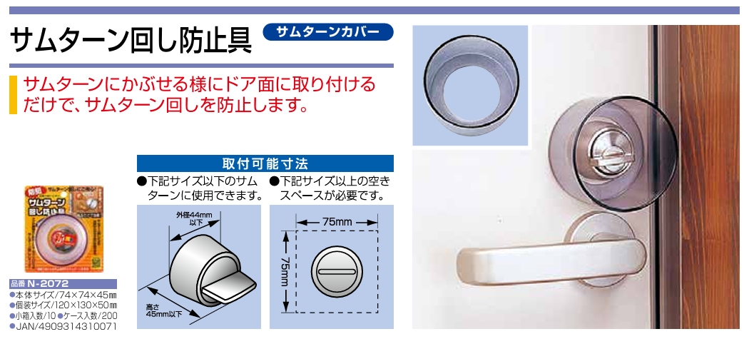 ドアの隙間、カギの隙間、ポスト口、のぞき穴からのサムターン回しを防止するサムターンガードです。