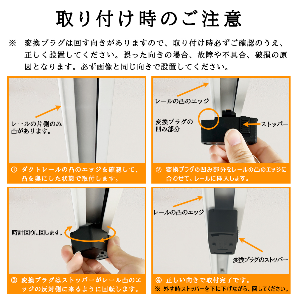 ● ダクトレールに取り付けの際、設置方向にご注意ください。誤った方向の場合、故障や不具合、破損、変換プラグが外れにくくなる原因となります。