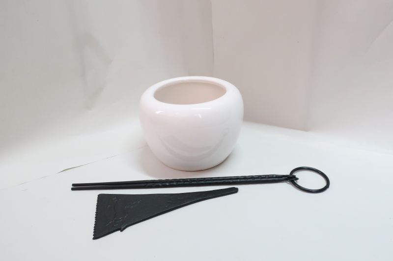 オリジナルカラー、手火鉢、白色(ホワイト)火鉢、南部鉄火箸、灰ならしの3点セット