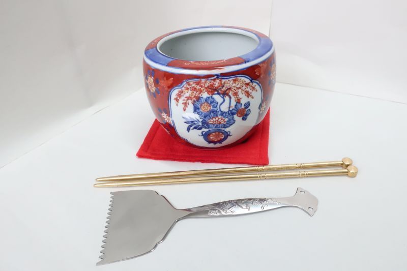 手火鉢 赤青花柄火鉢 真鍮火箸、ステン灰ならし、毛氈付きセット