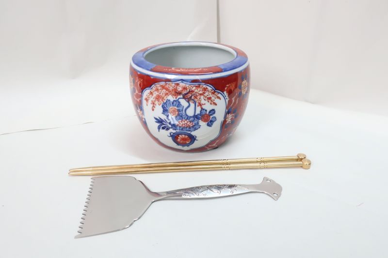 手火鉢セット、赤青花柄火鉢H10cmxW14cm、真鍮火箸、ステン灰ならし、