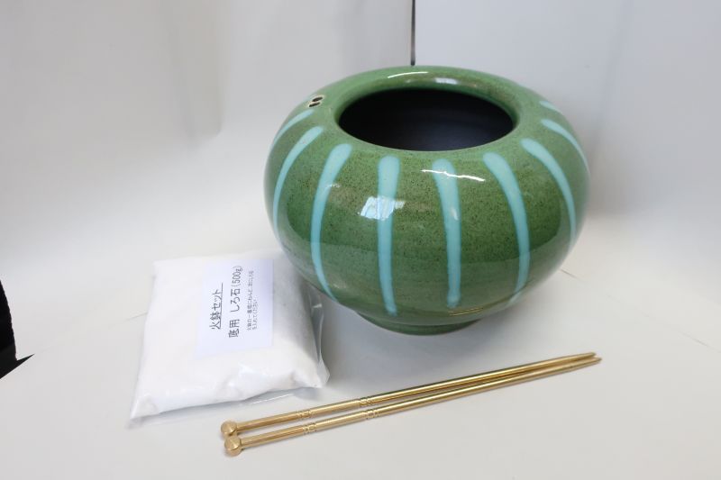 ストライブ手火鉢セット(緑・線薄緑) 真鍮火箸、底砂セット販売