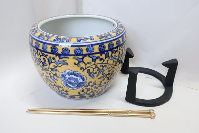 手火鉢セット〜黄バラ火鉢H15x20cm、真鍮火箸、五徳(小)、手火鉢3点セット