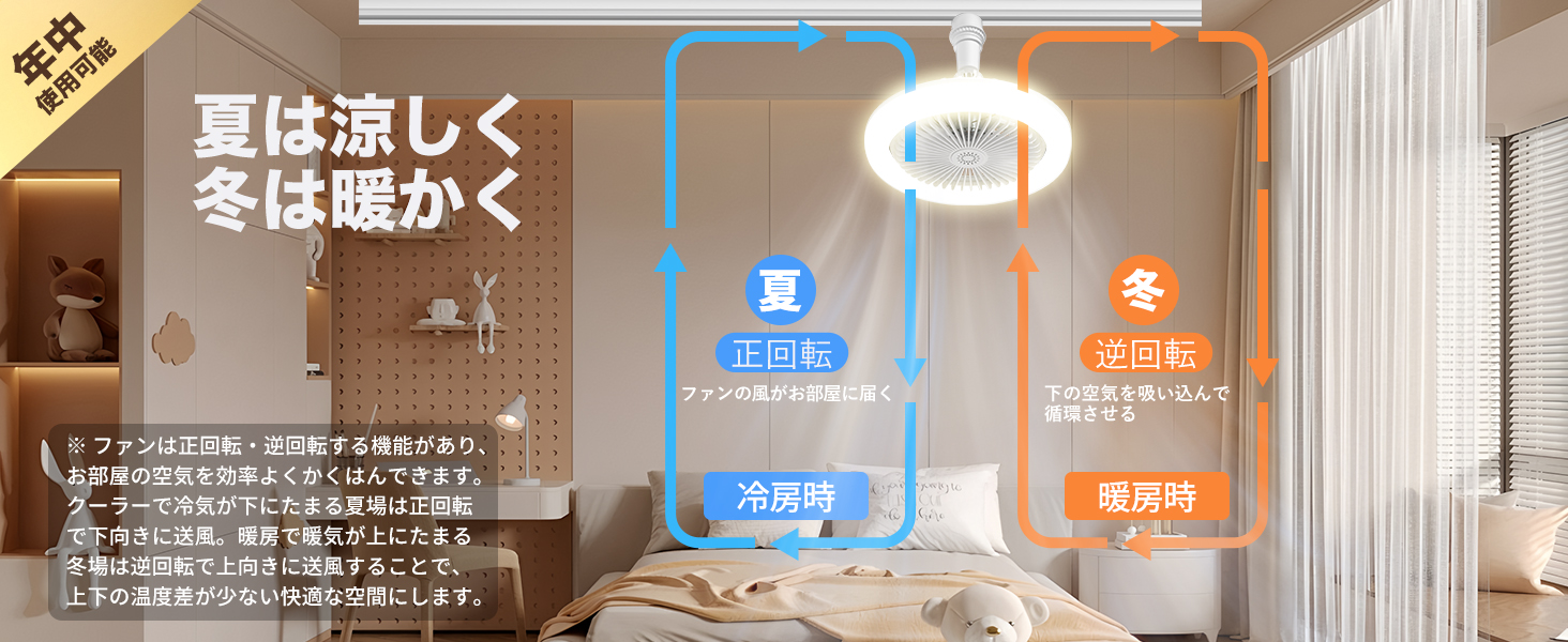 【強化版.正逆回転】新たに追加された正逆回転機能により、夏は涼しい風を送り、冬は暖かい空気を循環させることで一年中快適な環境を実現。