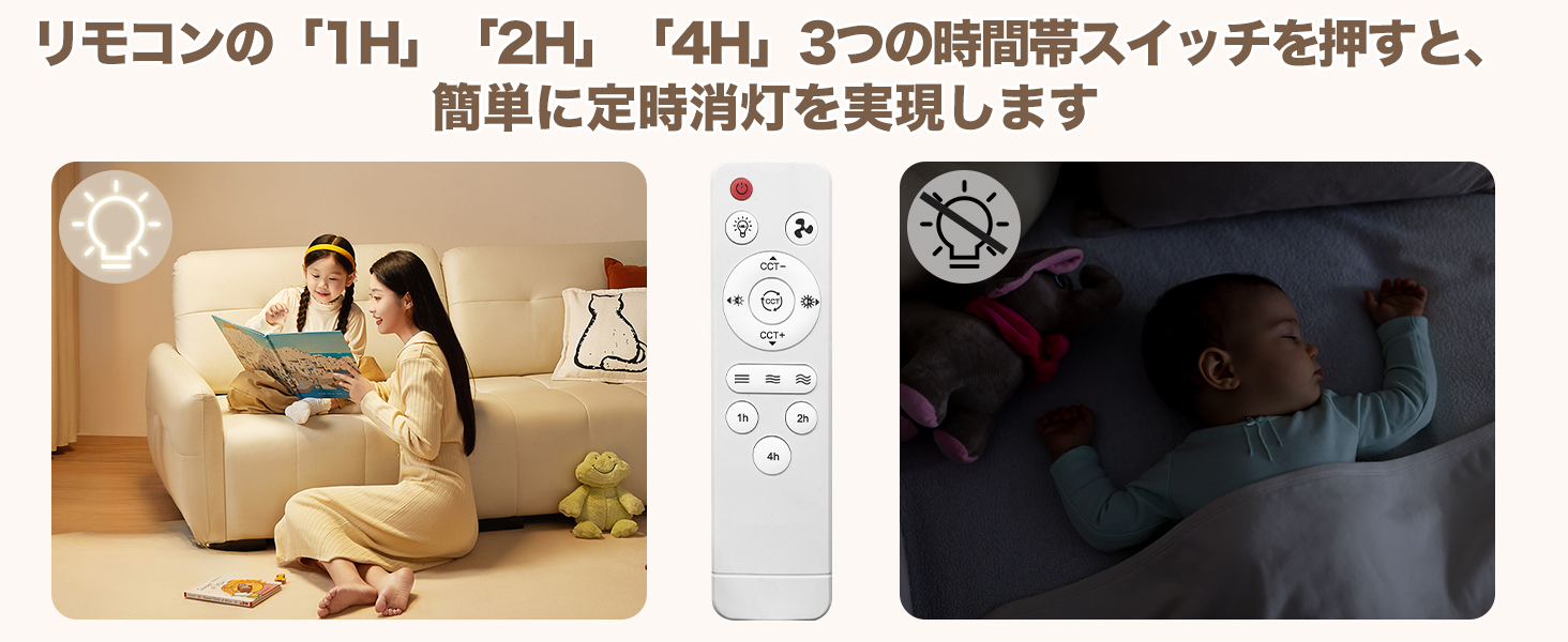 【リモコン操作.無段階調光調色.3段階風量】リモコンで簡単に調光.調色可能。昼光色.昼白色.電球色の3色を10%〜100%まで無段階で切り替え。風量は「弱」「中」「強」の3段階で調整できます。