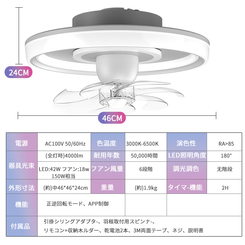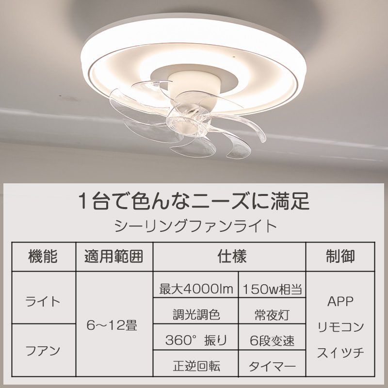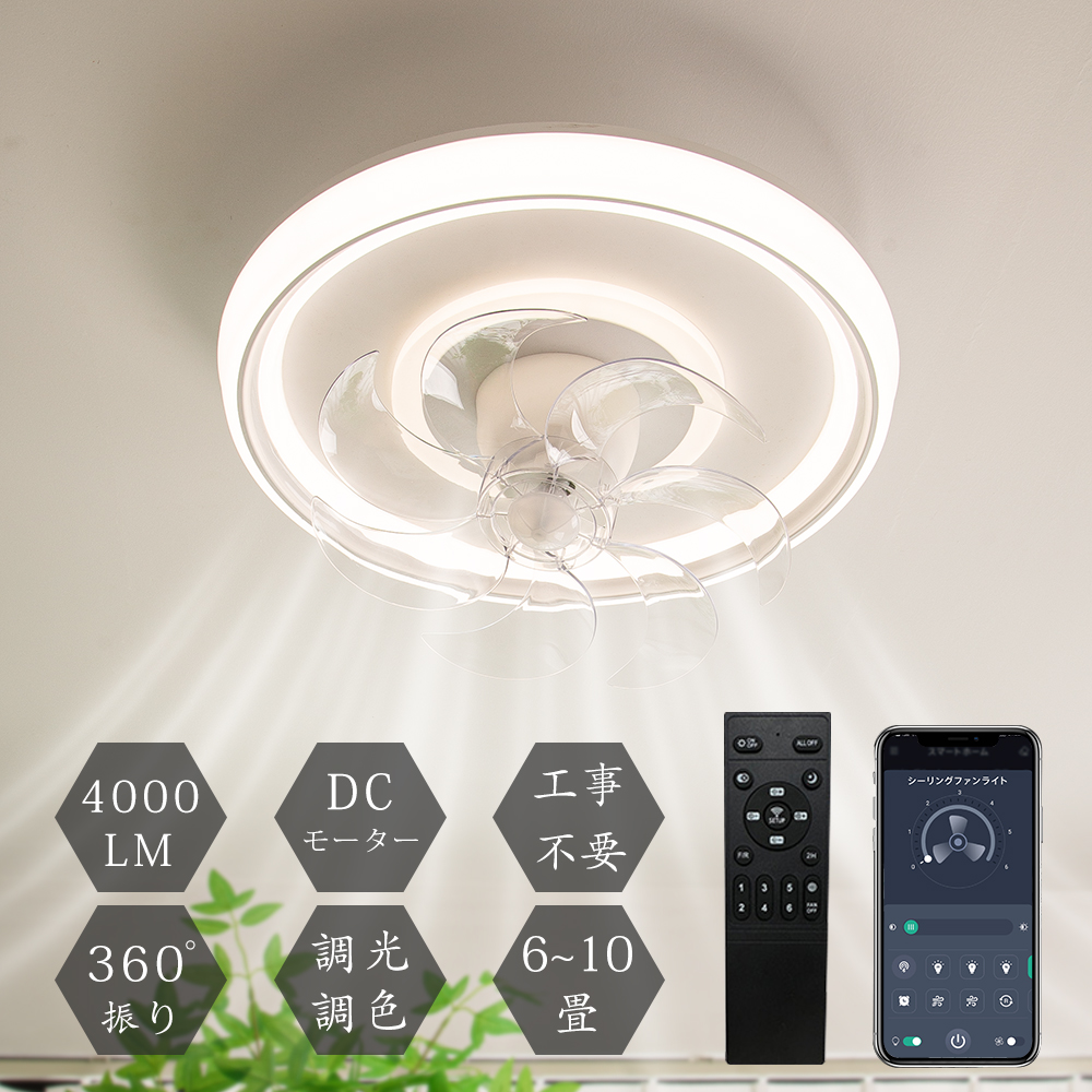 シーリングファンライト led 150W相当 4,000lm 扇風機 サーキュレーター DCモーター 正逆回転切替 調光調色 照明器具 換気 天井照明 大型 Φ46cm