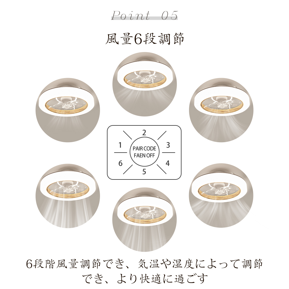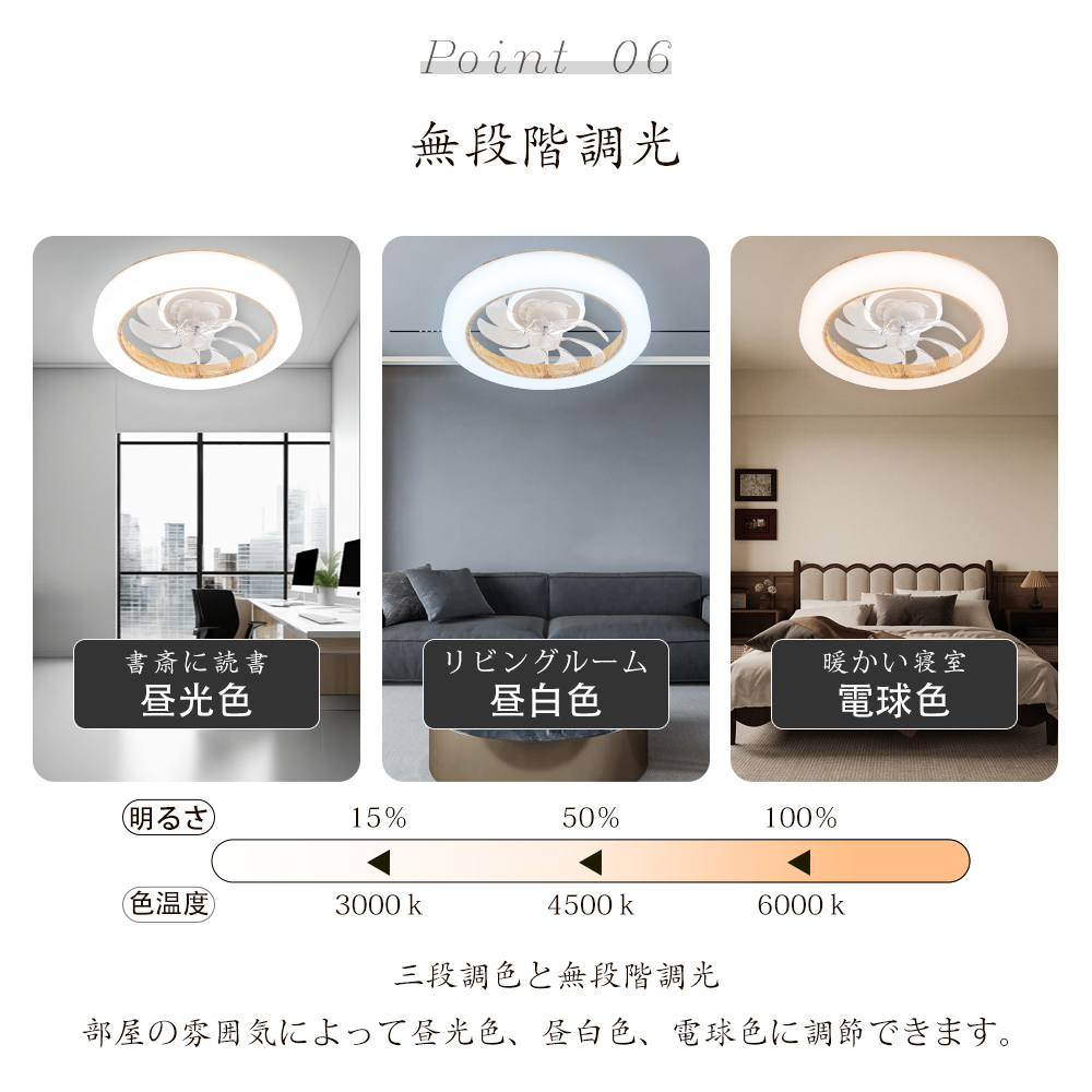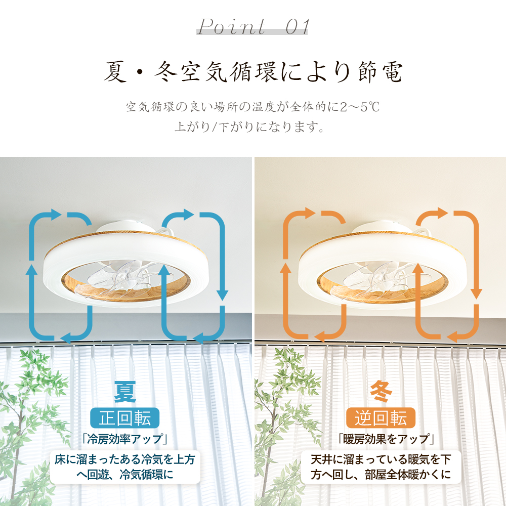 【正逆回転.調光調色&風量調節】夏は涼風、冬は暖房の空気を循環させるなど、季節を問わず活用可能。無段階調光調色と6段階風量調節でシーンに合わせた最適な環境を簡単設定。