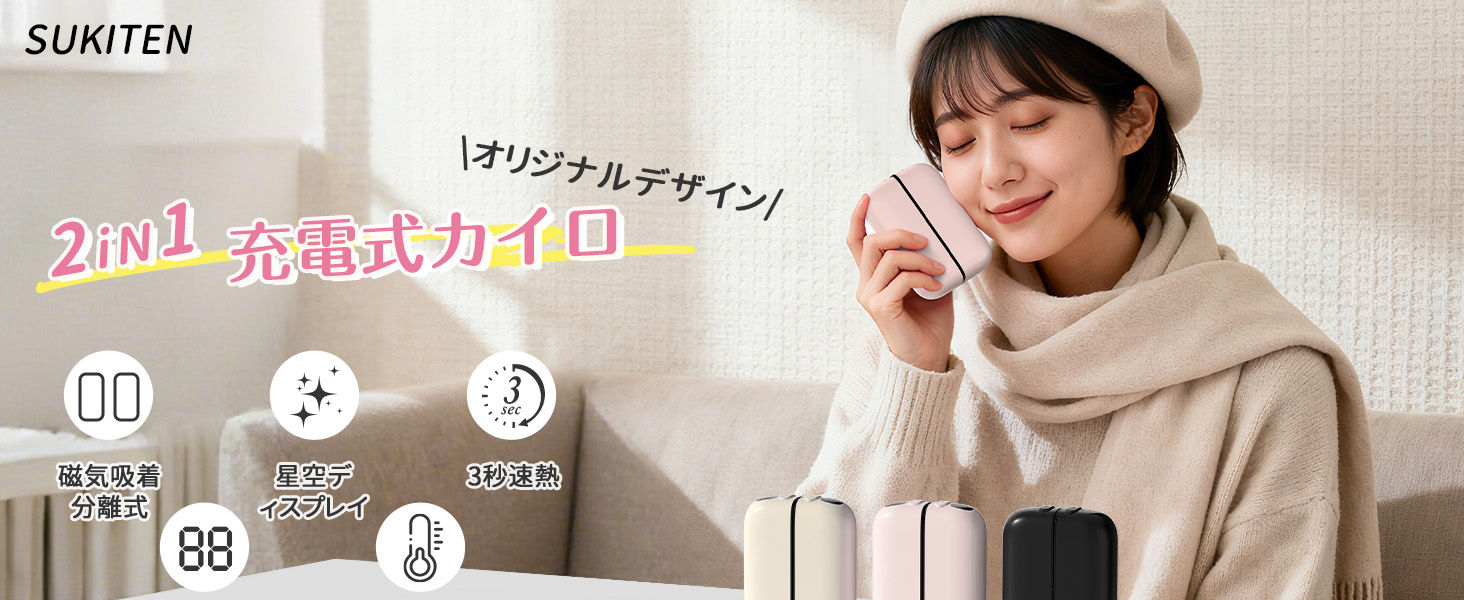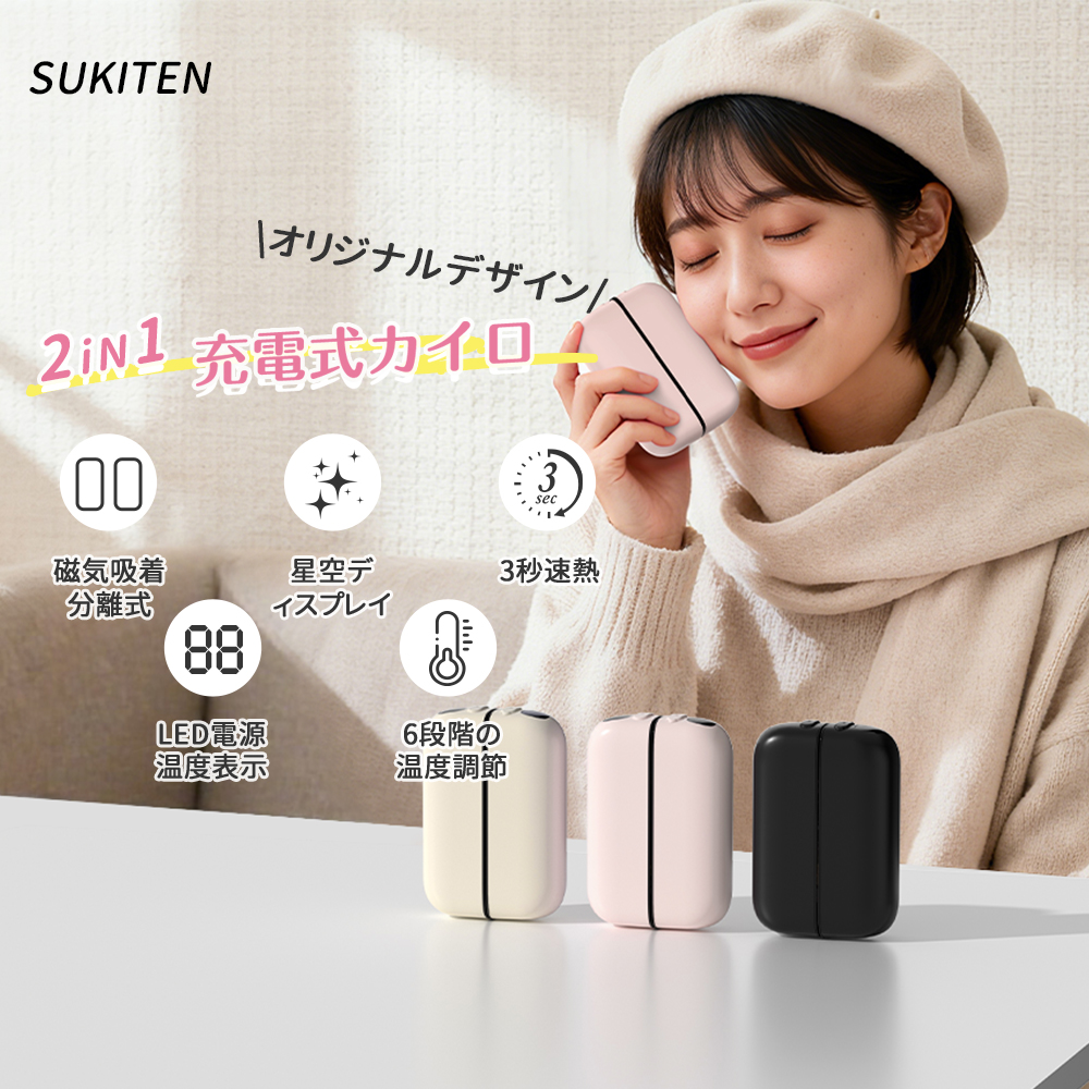 【マグネット分離式・5V/2A急速充電】革新的なマグネット式設計により、2つに分離して使える充電式カイロ。
