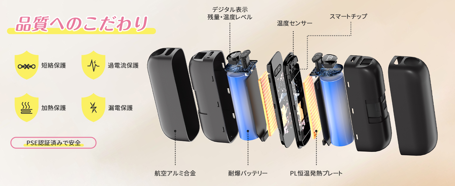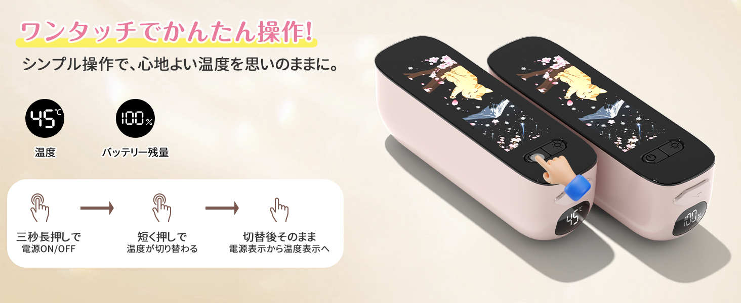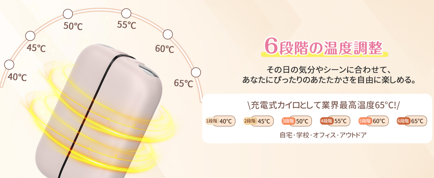 【6段階温度調整・3秒で急速両面発熱】40℃/45℃/50℃/55℃/60℃/65℃の温度調整が可能で使用シーンに合わせて最適な温度をお選びいただけます。