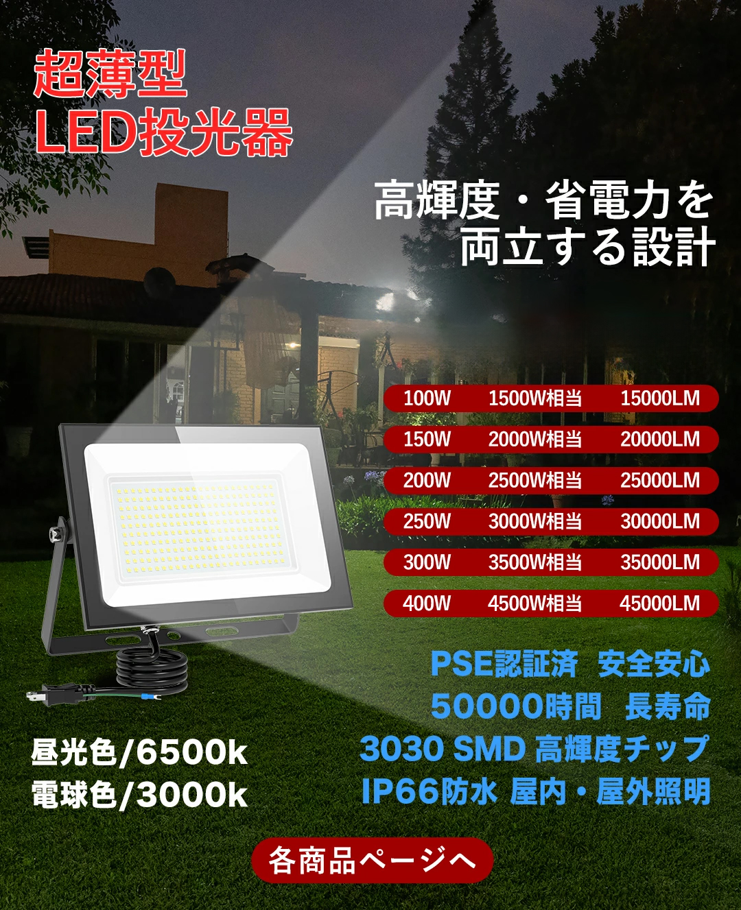 【IP66防水&超耐久性のある投光器】
