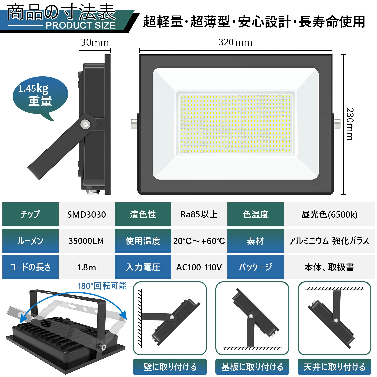 本日限定sale【超爆光.超薄型】投光器 屋外 作業灯 ledライト 300W 35000LM IP66防水 昼光色 6500K 高輝度 高放熱 省エネ軽量 120°広角 100V 屋外照明 防水