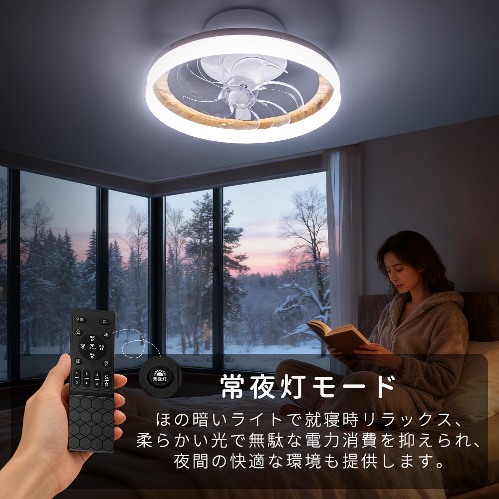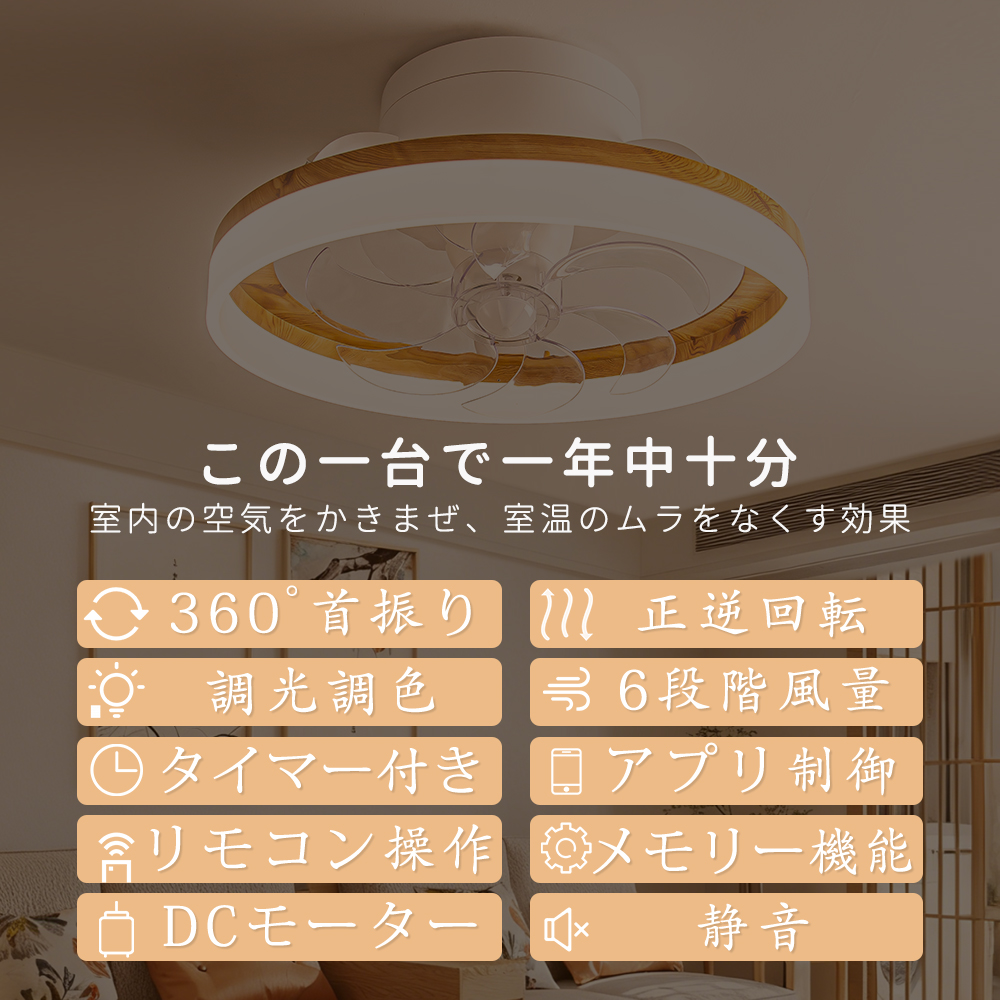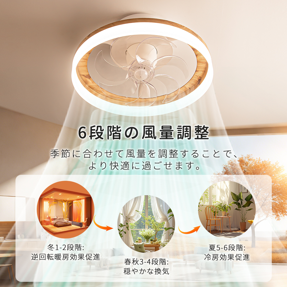 「正逆回転」夏は冷気を効率よく循環させ、冬は暖気を部屋全体に行き渡らせます。6段階調整で就寝時の微風から換気時の強風までシーンに合わせた風を自在にコントロールできます。【目に優しい】無点滅な安定照明によって明るさ10%の常夜灯モードでも均一で柔らかな光を実現、長時間の読書やパソコン作業でも快適です。
