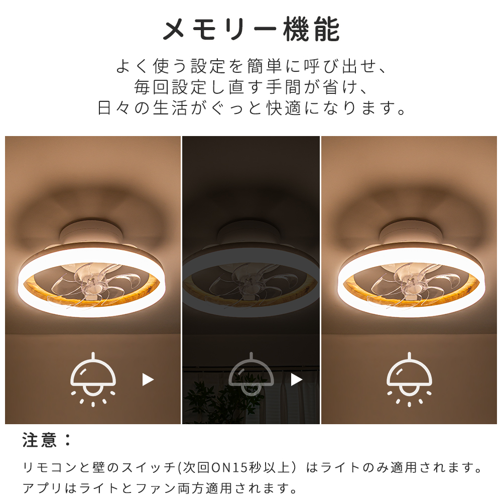 「アプリ.リモコン.壁スイッチ」簡単操作1/2/4/8時間のオフタイマー機能で就寝時間に合わせて自動で停止。消し忘れを防ぎ、省エネにも貢献します。メモリー機能が前回の設定を記憶し、電源を入れるだけで同じ状態を再現します。壁スイッチを素早く2回押すだけで、電球色→昼白色→昼光色→節電モードへ即座に切り替え可能。夜間の活動でも最適な光を簡単に選べます。