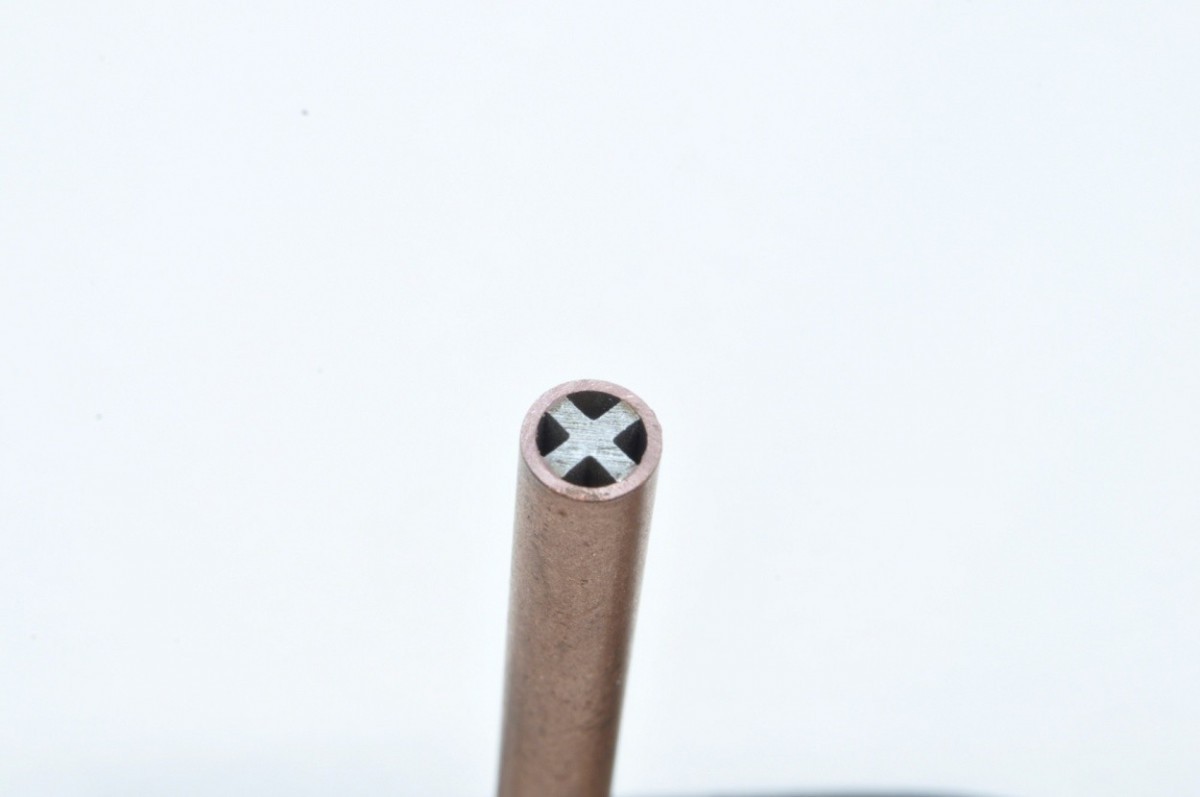 ナイフや包丁のハンドルに5mmの穴に埋込、カットして研磨していただくと模様が浮き出て装飾性がでます。中は空洞になっておりますので、お好みで色付樹脂など流してもいいかと思います。カットには金属用のこぎりでカットできます。