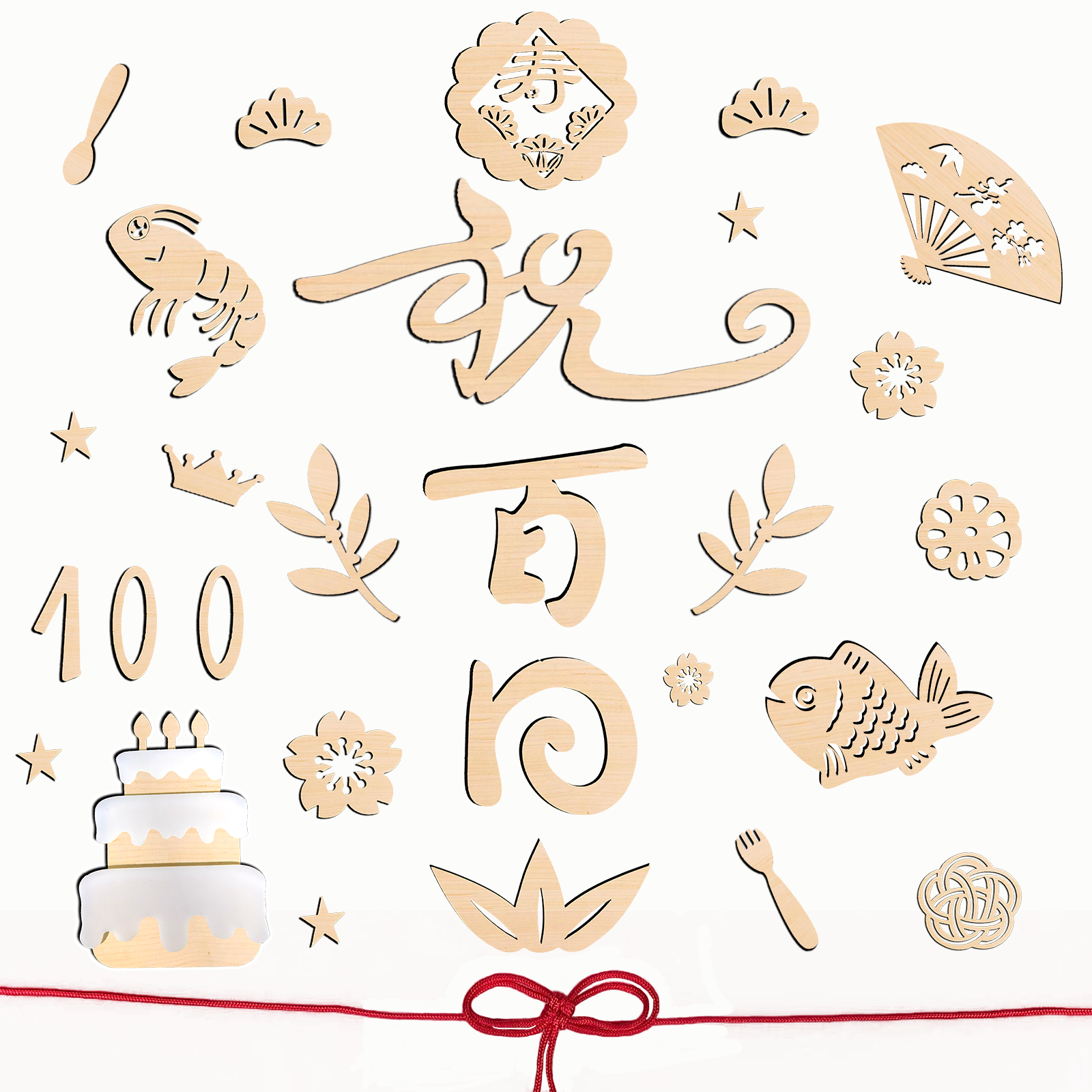 【セット内容】合計29枚:祝、百、日、各1枚、魚*1枚、桜*3枚、寿*1枚、エビ*1枚、ケーキ*1枚、王冠*1枚、梅結び*1枚、扇子*1枚、松の葉*2枚、蓮根*1枚、竹の葉*1枚、数字1*1枚、数字0*2枚、フォーク*1枚、スプーン*1枚、葉*2枚、星*4枚、赤の紐*1枚。厚さ約3mm。<br>