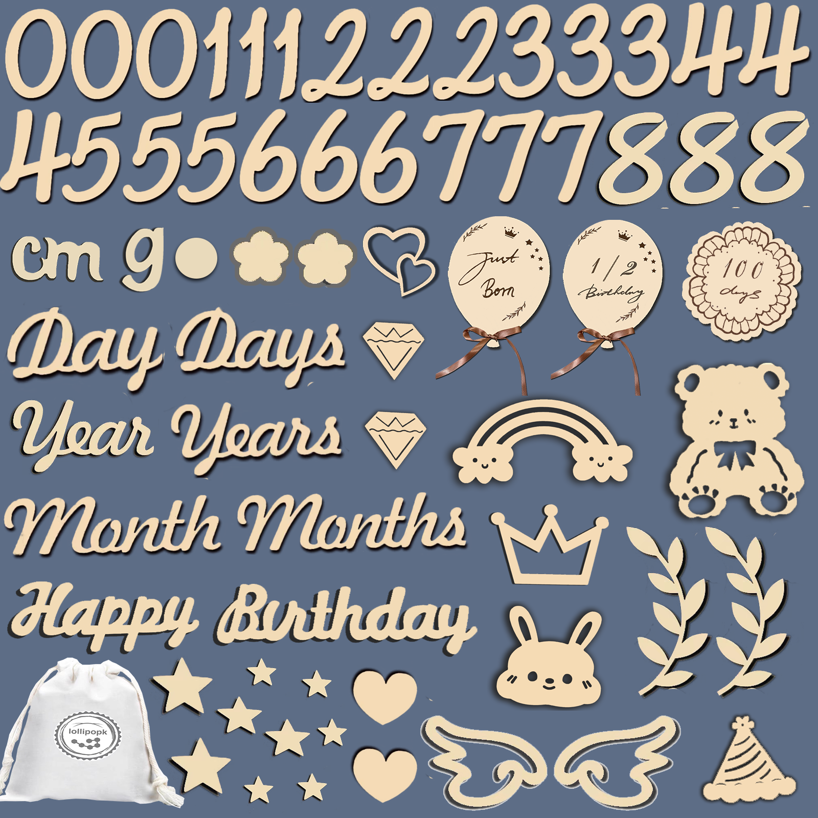 【セット内容】合計66枚、0-9の数字、day(s)、month(s)、year(s)、happy birthday、just born、100 days birthday、飾りの葉、飾りの花、星、ハート、羽、王冠、体重測定(g)、身長測定(cm)などがあります。また、収納袋付きで利用後の片付けも簡単です。