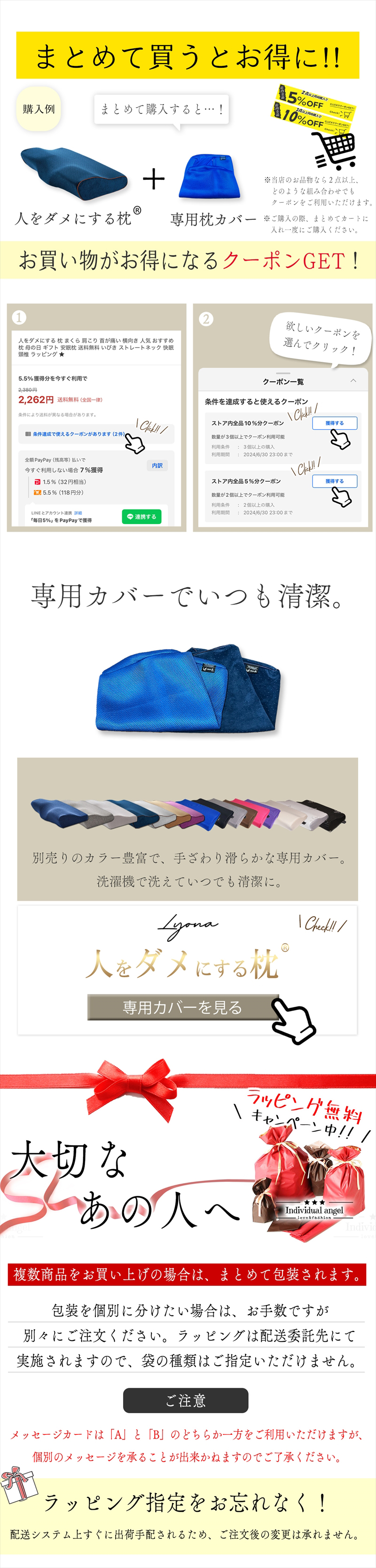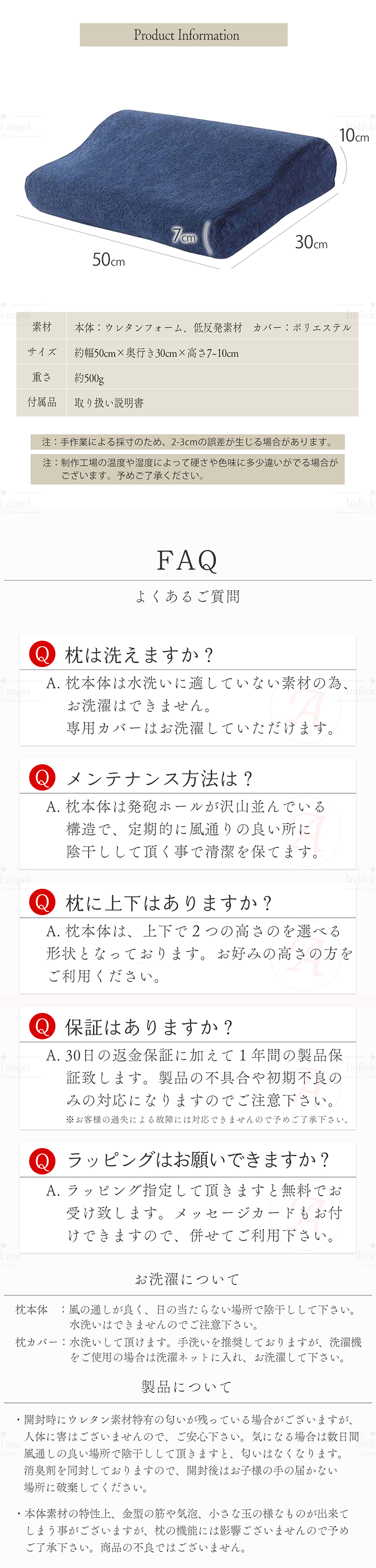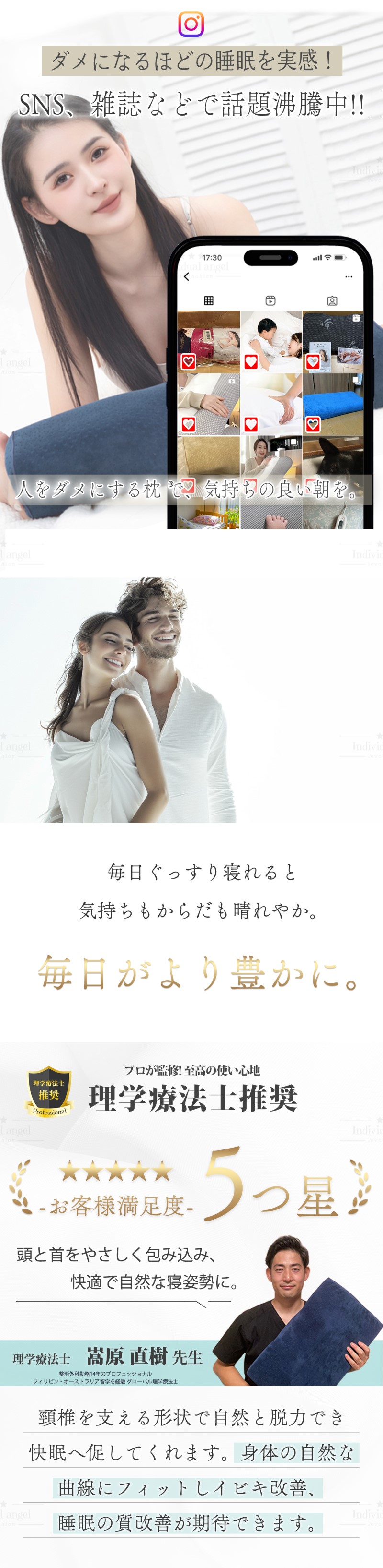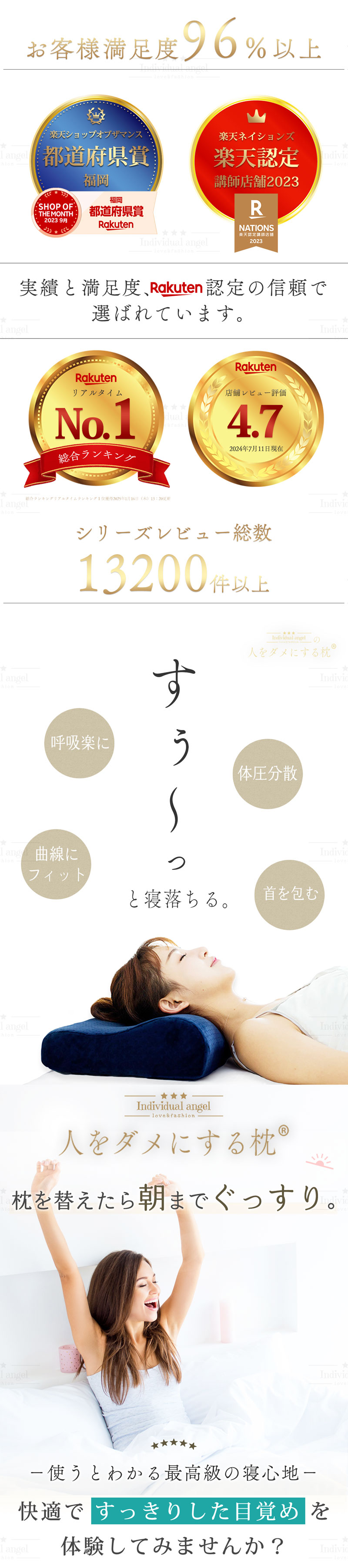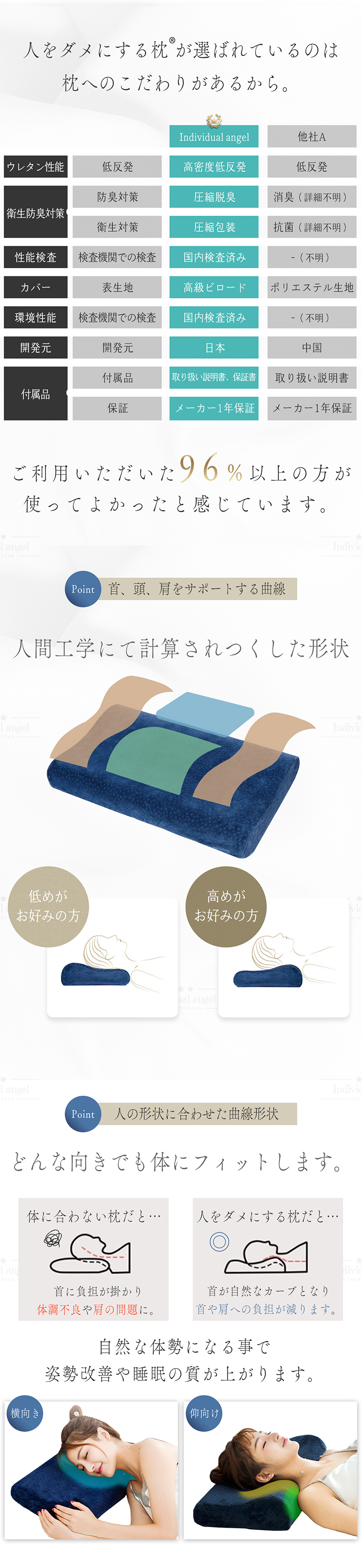 頭や首を科学的にサポートし、横向き寝にも仰向け寝にも対応しています。