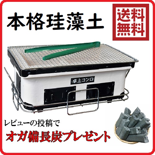 オガ炭プレゼント 七輪 角型ワイド 付属品多数 (火ハサミ 角網 置台 目皿) しちりん 長角 卓上 バーベキュー 珪藻土 おしゃれ 自宅 煙が少ない 日の丸燃料