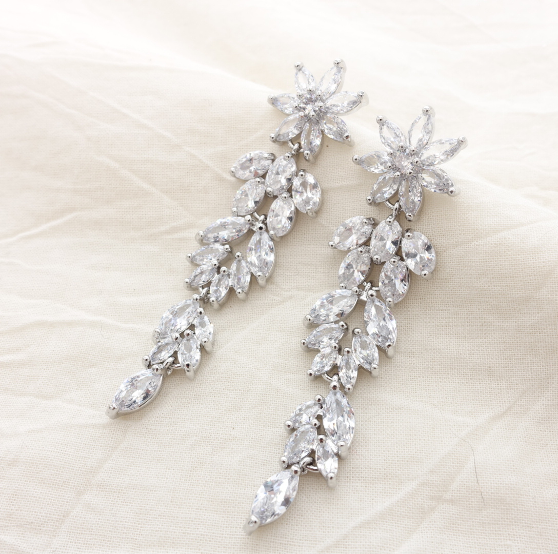 ウェディング アクセサリー【キュービック ジルコニア フラワーリーフ ロングピアス】ブライダル 結婚式 小物