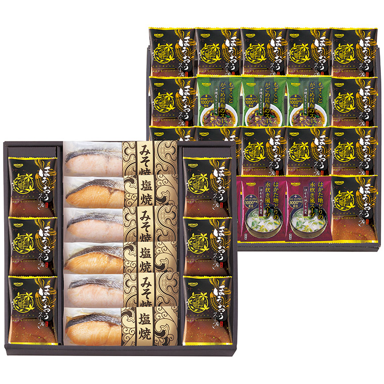 ■商品内容:鮭切り身(塩焼き・みそ焼き)各3・スープ(ほうおう)×20・スープ(はかた水炊き・もずく)各3 【卵・小麦】