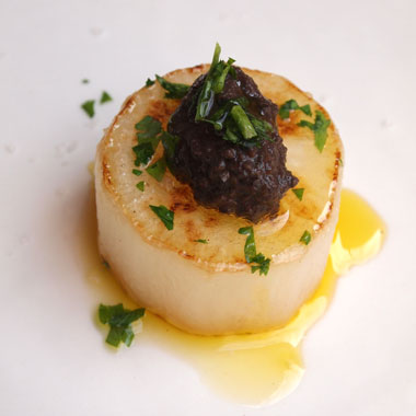 大根ステーキの上にちょこんとオリカテセンのオリーブパテを。