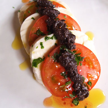 ごく普通のトマトとモッツァレラチーズをつかったシンプルな前菜に、このオリカテセンのオリーブパテをのせると、グ〜ンとグレードアップして大人の味に。